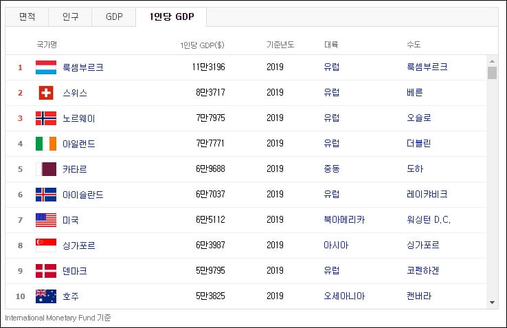 국가별 gdp 순위를 확인했으니 이제는 1인당 GDP를 한번 살펴보도록 할 텐데요... 1인당 gdp 자료는 2019년도에 발행한 IMF 자료를 참고했으며 검색 엔진에서 치면 나오는 자료입니다.