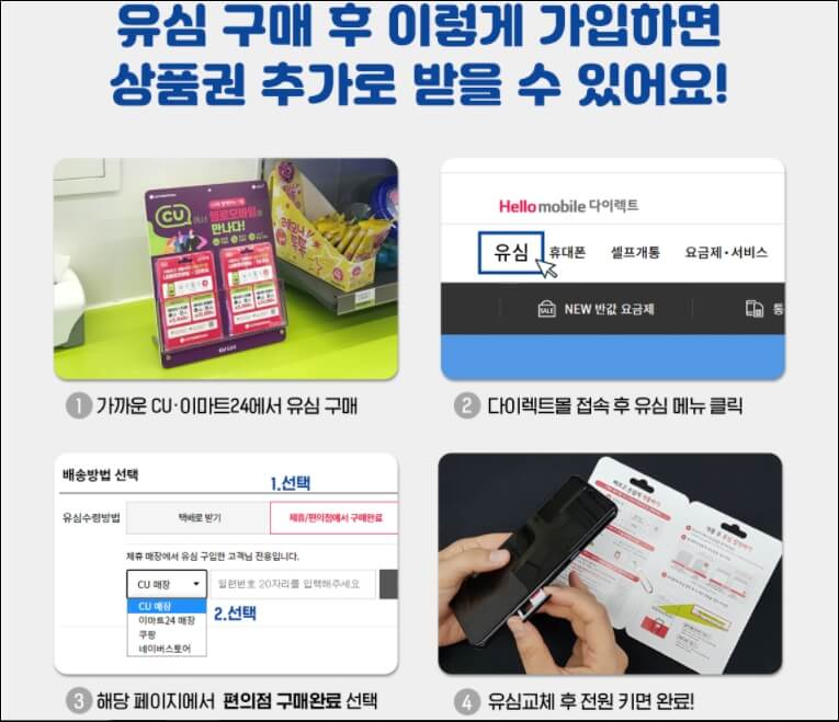 가입방법은 LG와 SK 모두 동일합니다. 엘지는 CU편의점과 이마트, SK는 CU와 홈플러스 매장, KT엠 모바일은 세븐일레븐, 미니스톱, 씨스페이스에서 유심을 구입하신 후 유심 등록 메뉴를 클릭하시고 해당 페이지에서 편의점 구입을 선택하시고 일련번호 20자리를 입력하신 후에 전원을 켜시면 끝납니다. 그러면 이전에 가입되어 있던 통신사는 자동으로 해지가 됩니다.