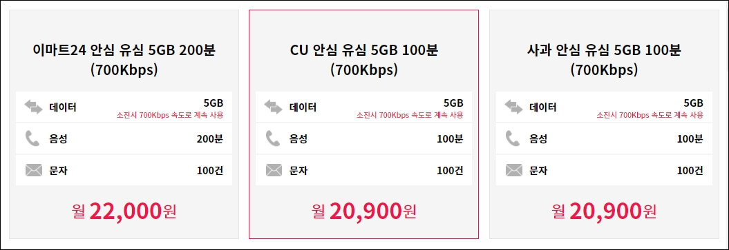 제가 이번에 요금제를 알아보면서 여러 가지를 봤는데 우선 요금제 돈보다는 데이터와 음성이 가장 중요합니다. 아래 월 22000원짜리 이마트 24 안심 유심 상품 같은 경우에는 데이터 5GB를 소진하면 700 kbps 속도로 무제한 쓸 수 있다고 나오는데요... 쉽게 말해 1,000 kbps->1 mbps입니다. 유튜브에서 1 mbps로 유튜브 영상, 웹서핑, 카카오톡 사진 업로드 등