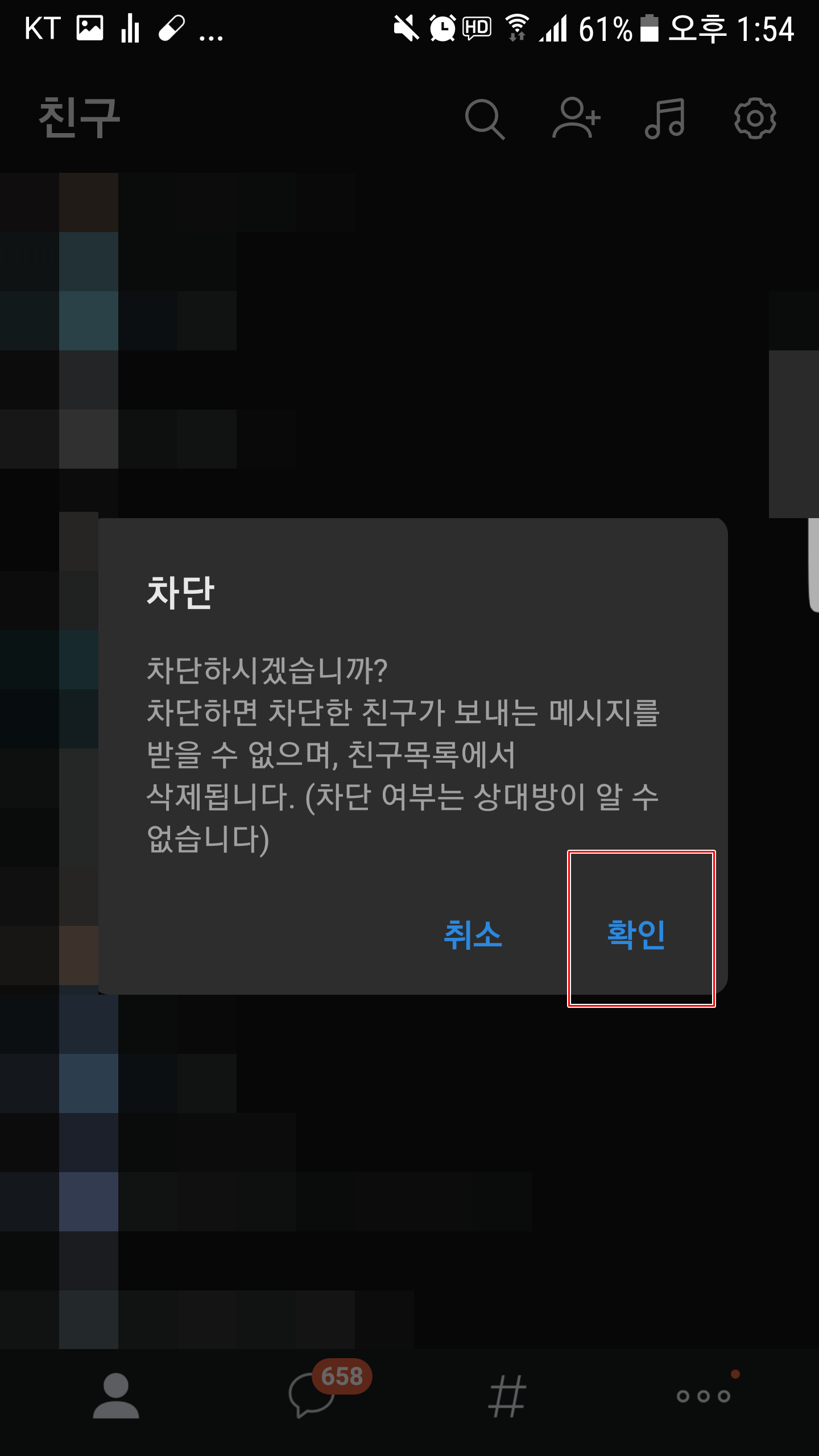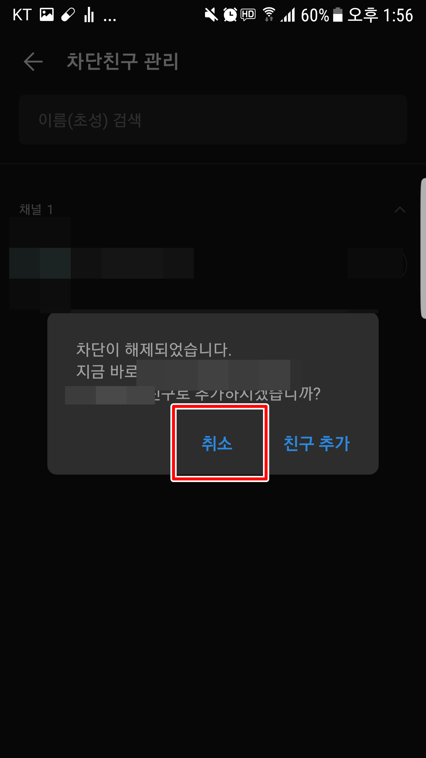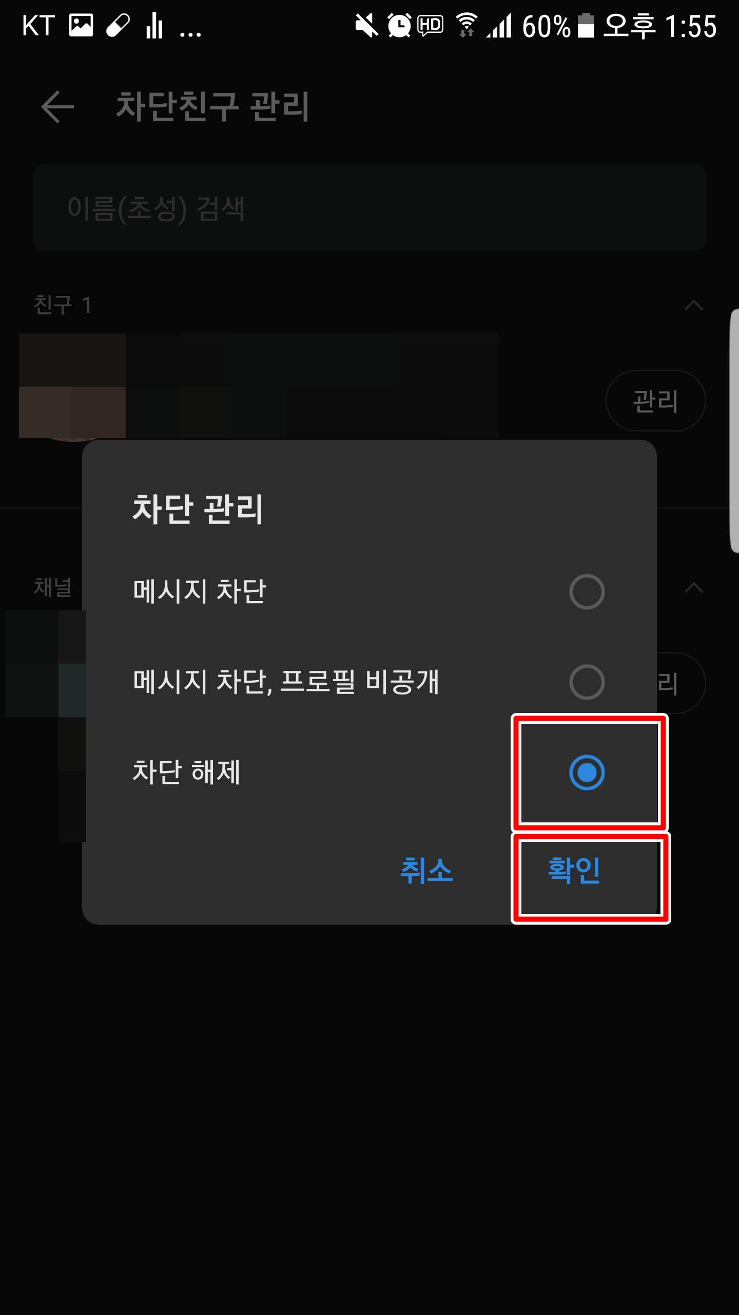 그럼 메시지 차단, 메시지 차단, 프로필 비공개, 차단 해제 선택 옵션이 나오는데 여기서 차단 해제를 선택하시고 확인을 누르신 다음 친구로 추가하겠냐는 질문에 취소를 눌러줍니다.