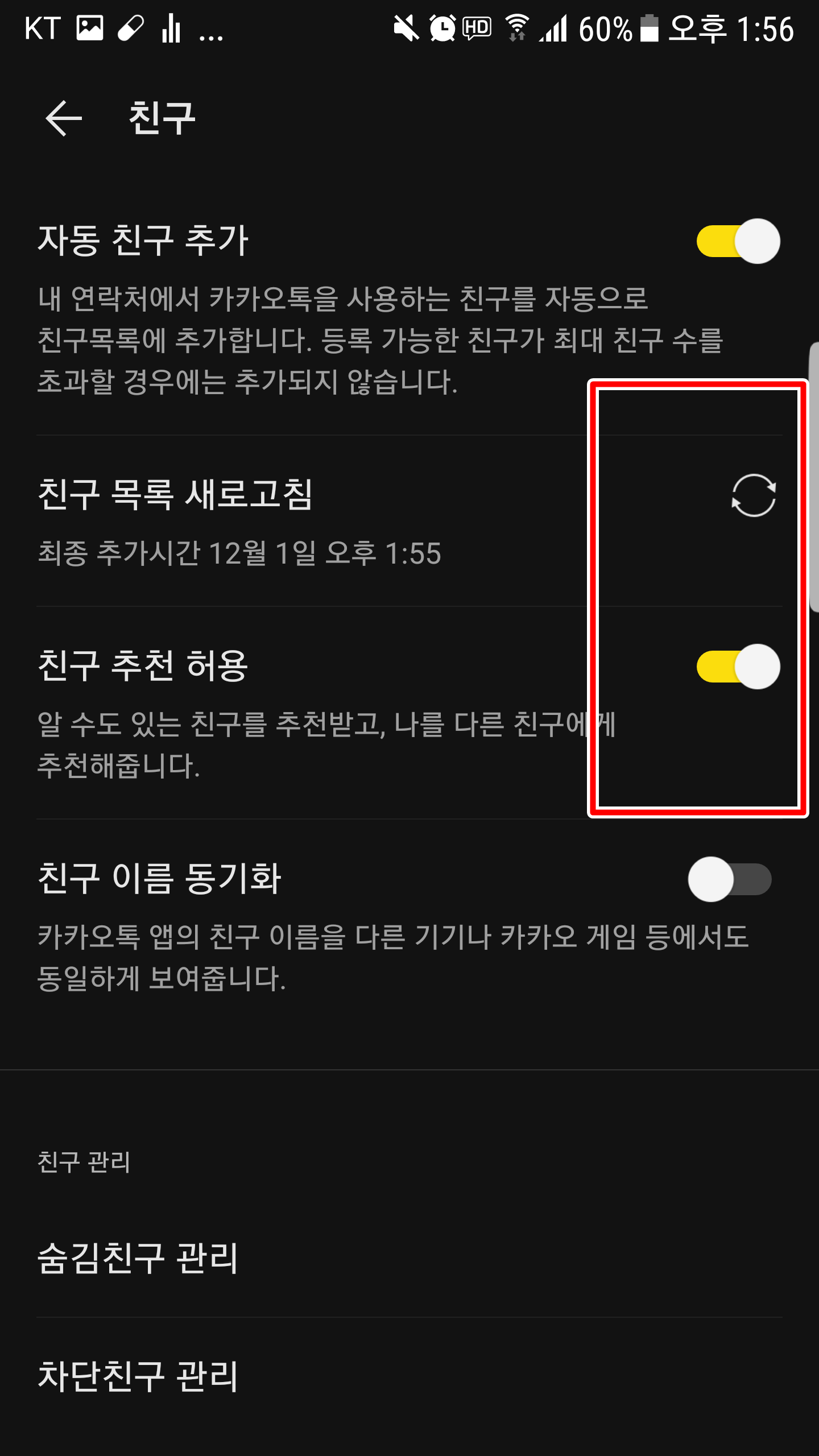 그리고 친구 탭에서 친구 추천 허용을 오른쪽으로 밀어서 활성화해주신 다음 친구 목록 새로고침을 눌러봅니다. 그리고 그럼 오른쪽과 같이 친구 목록에 추천 친구 탭이 뜨는데요... 이 탭을 눌러봅니다.