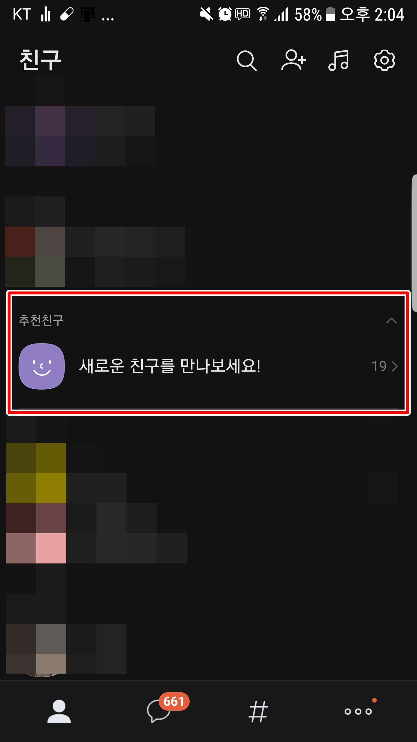 우측 아래 메뉴를 눌러주신 다음 위에 톱니바퀴 메뉴를 눌러주시고 친구 탭에 접속해봅니다.