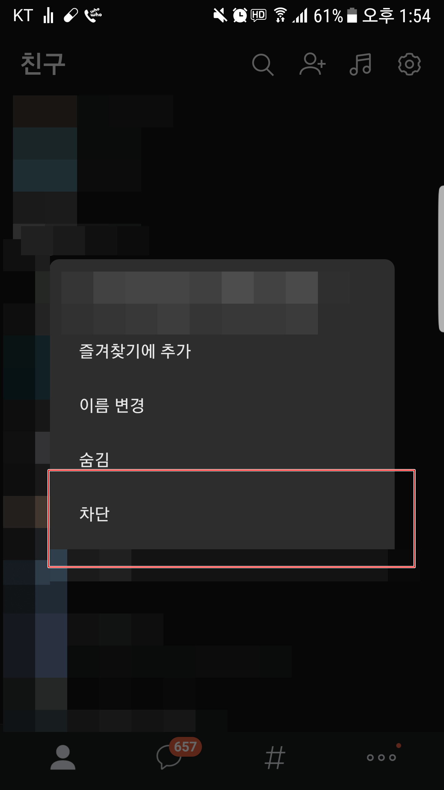 이 방법이 상대방이 나를 추가했는지 확인할 수 있는 100%의 방법은 아닙니다. 그 이유는 상대방이 카카오톡 설정을 어떻게 해놨느냐에 따라서 달라지기 때문인데요... 이 부분은 포스팅을 진행해 나가면서 알아보도록 하겠습니다. 그럼 먼저 알아보고자 하는 친구 목록을 누르고 계시면 이름 변경, 숨김, 차단 창이 나오는데요. 여기서 차단을 눌러주시고 확인을 눌러줍니다.