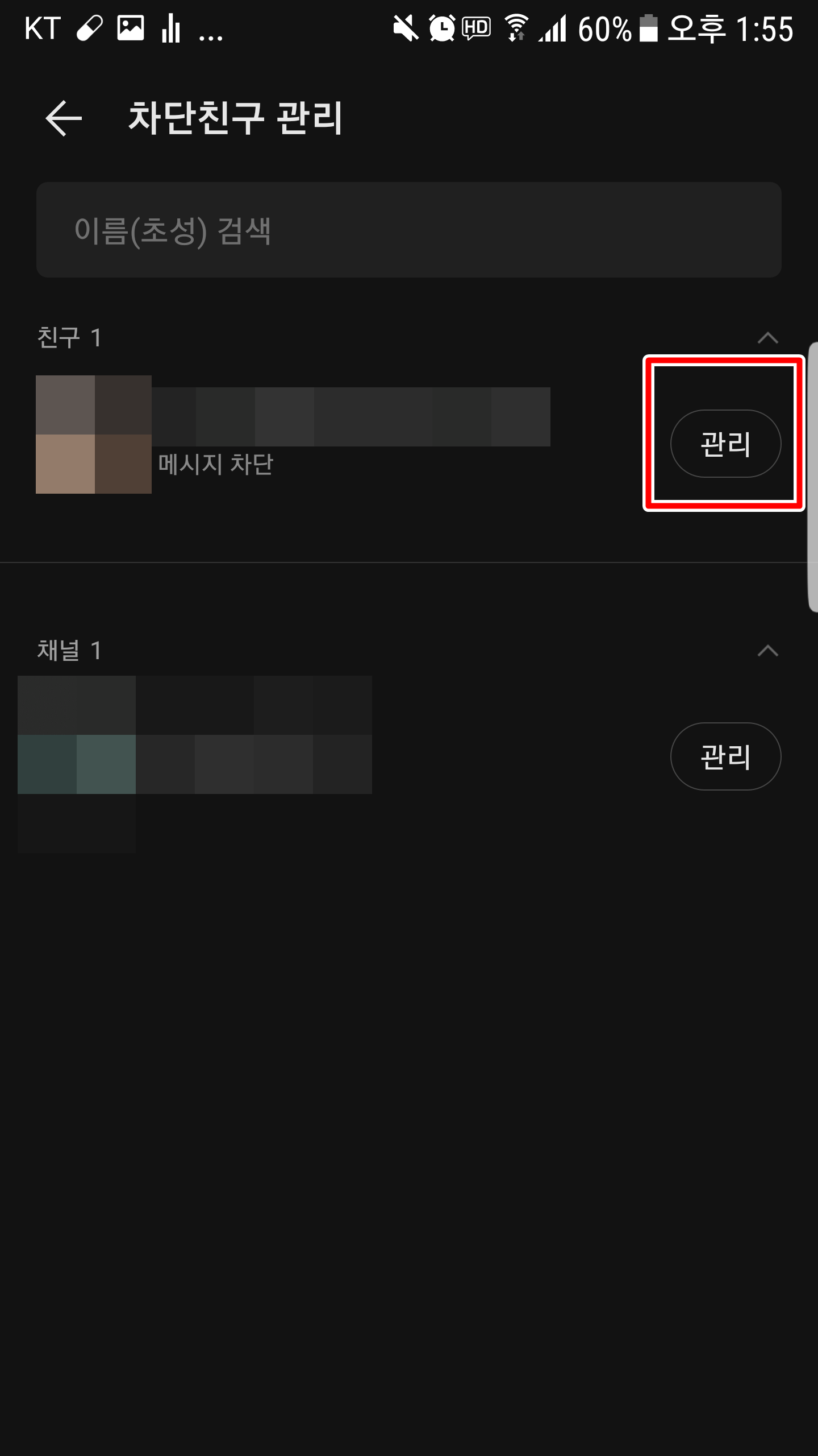 친구 관리 탭에서 차단 친구 관리를 눌러주시면 오른쪽과 같이 차단한 목록에 친구가 뜨는데요... 여기서 관리를 클릭합니다.