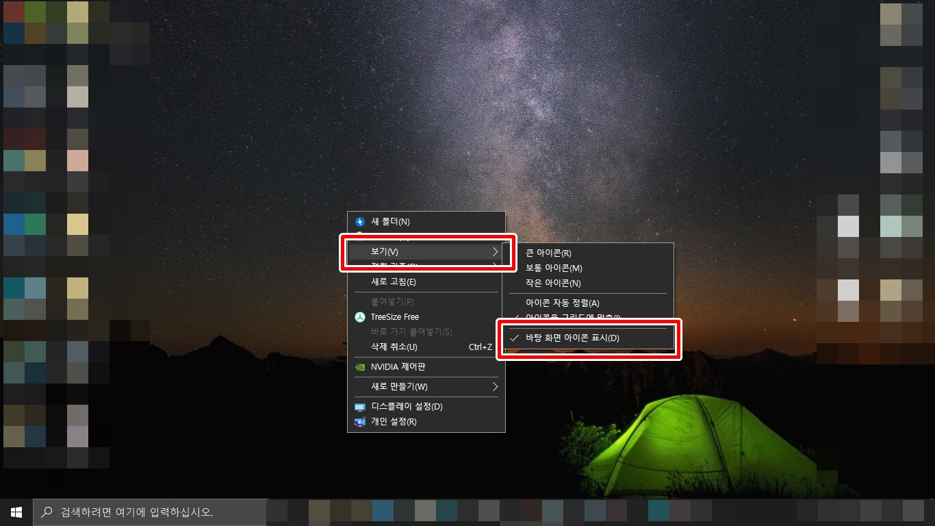 마우스에서 우클릭을 하시고 보기 탭을 마우스 커서를 옮기면 [바탕 화면 아이콘 표시] 탭이 보입니다. 기본적으로는 체크 모양이 좌측에 있는데요. 이 탭을 클릭하면 바탕화면에 있는 모든 아이콘이 사라집니다. 그럼 한번 눌러볼까요?