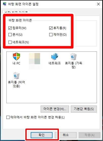 테마 탭을 클릭하시고 우측에 [바탕 화면 아이콘 설정]을 클릭합니다.