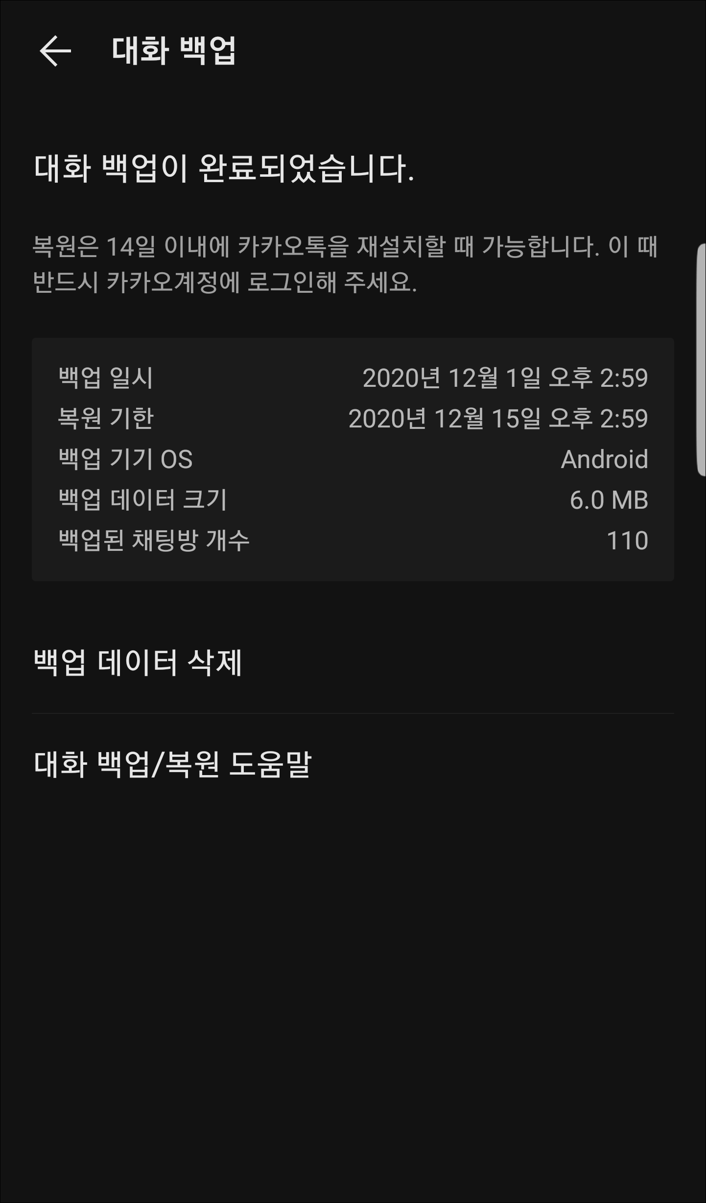저도 현재 데이터 백업을 해놓은 상태인데요.. 이렇게 백업을 해놓으면 언제 스마트폰을 바꿔도 바로 복구가 가능하니 참 편리한 기능 중에 하나인 것 같습니다. 그만큼 우리 삶에 카카오 톡 메신저가 담당하는 부분이 크기 때문이겠죠... 그래서 오늘은 백업과 대화 내용 복구하는 방법 그리고 카카오톡 백업/복구에 대한 질문과 답변.. 그리고 사설업체까지 간단하게 알아보도록 하겠습니다.