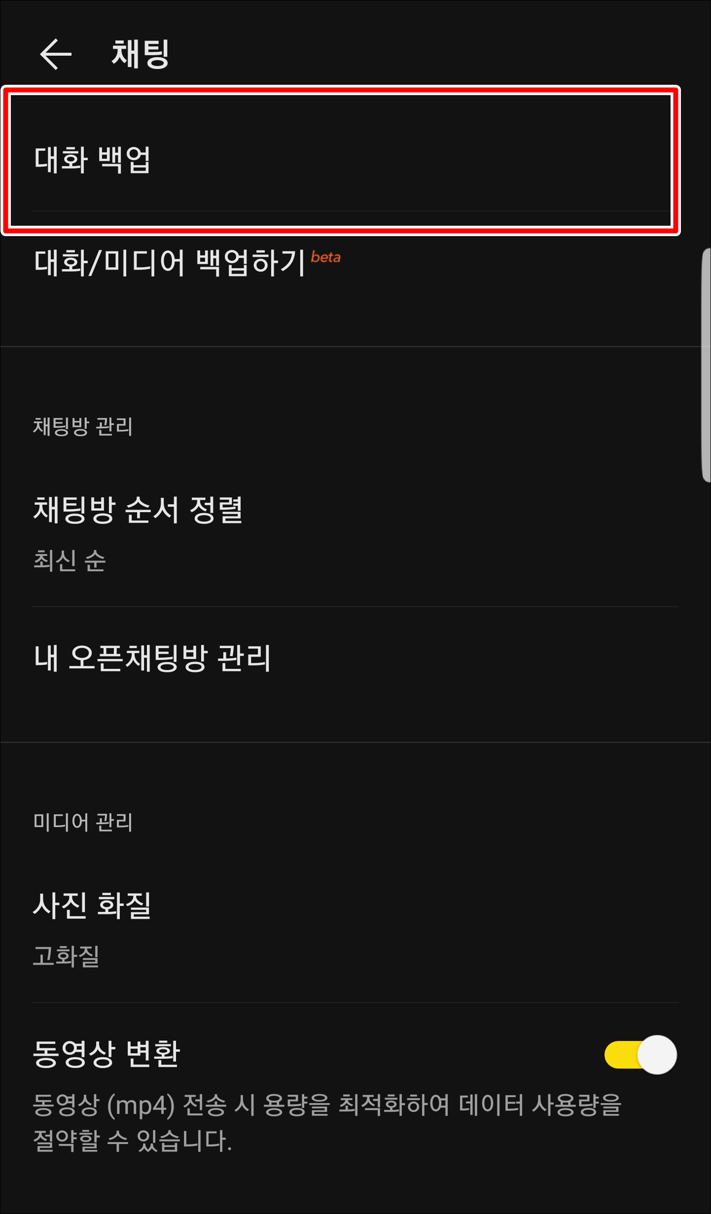 대화 백업이 진행 중입니다... 30~1분 정도면 모든 대화가 백업이 됩니다. 자 그럼 새로운 스마트폰을 구입했다고 가정하고 로그인을 시도해보도록 할까요?