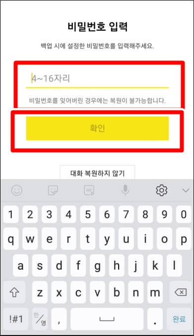 그럼 대화 복원하기 창이 나오는데요... 여기서 복원하기를 클릭하시고 비밀번호를 입력해 주신 다음 확인을 누르시면 모든 대화 내용이 복구가 완료됩니다.