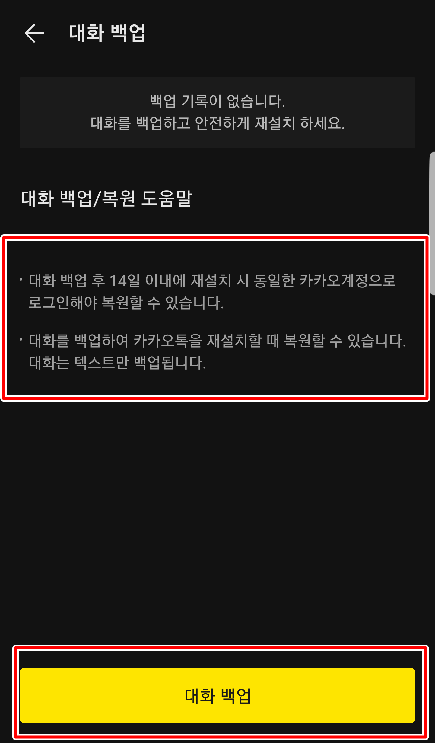 대화 백업을 눌러주신 후에 노란색 대화 백업을 눌러줍니다. 아래 사진에도 나와있지만 대화 백업 후 14일 안에 동일한 계정으로 로그인을 하셔야만 복원이 가능하다는 점, 그리고 복구는 대화 내용만 가능하고 사진이나 동영상을 복구가 불가능하다는 점 참고하시길 바랍니다.