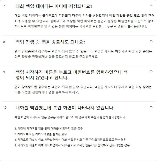 다음은 카카오톡 고객센터에서 백업과 복구에 대한 질문과 답변을 올려드릴 테니 참고하시면 되겠습니다. 1~3번 질문은 데이터 백업과 대화 내용 복구에 관한 질문인데 이 포스팅에서 전부 다뤘으므로 따로 올리진 않았습니다. 한 번씩 읽어보시면 몰랐던 부분들도 많이 알게 되실 거라 생각합니다.