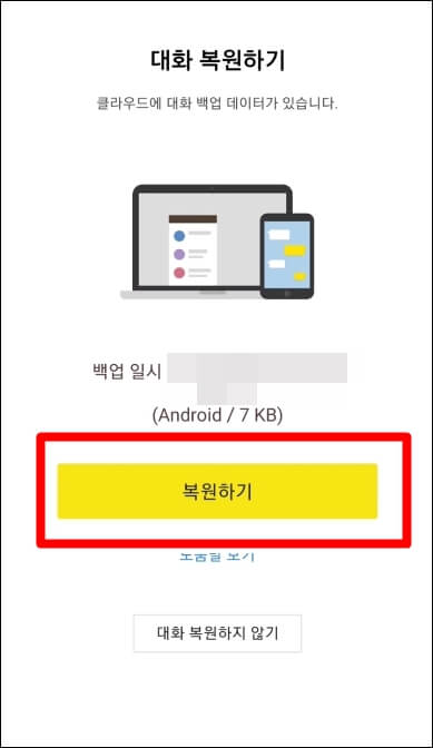 그럼 대화 복원하기 창이 나오는데요... 여기서 복원하기를 클릭하시고 비밀번호를 입력해 주신 다음 확인을 누르시면 모든 대화 내용이 복구가 완료됩니다.