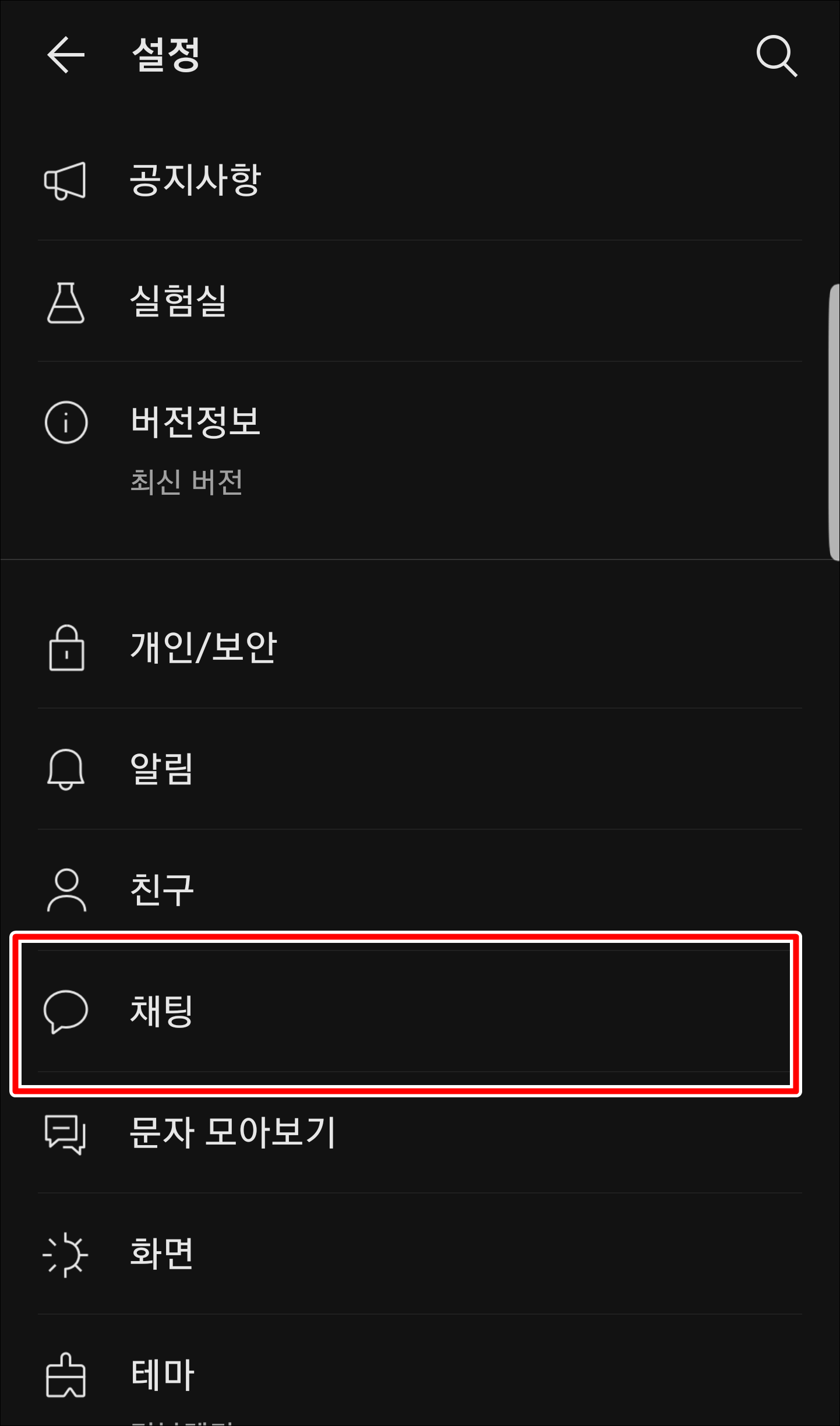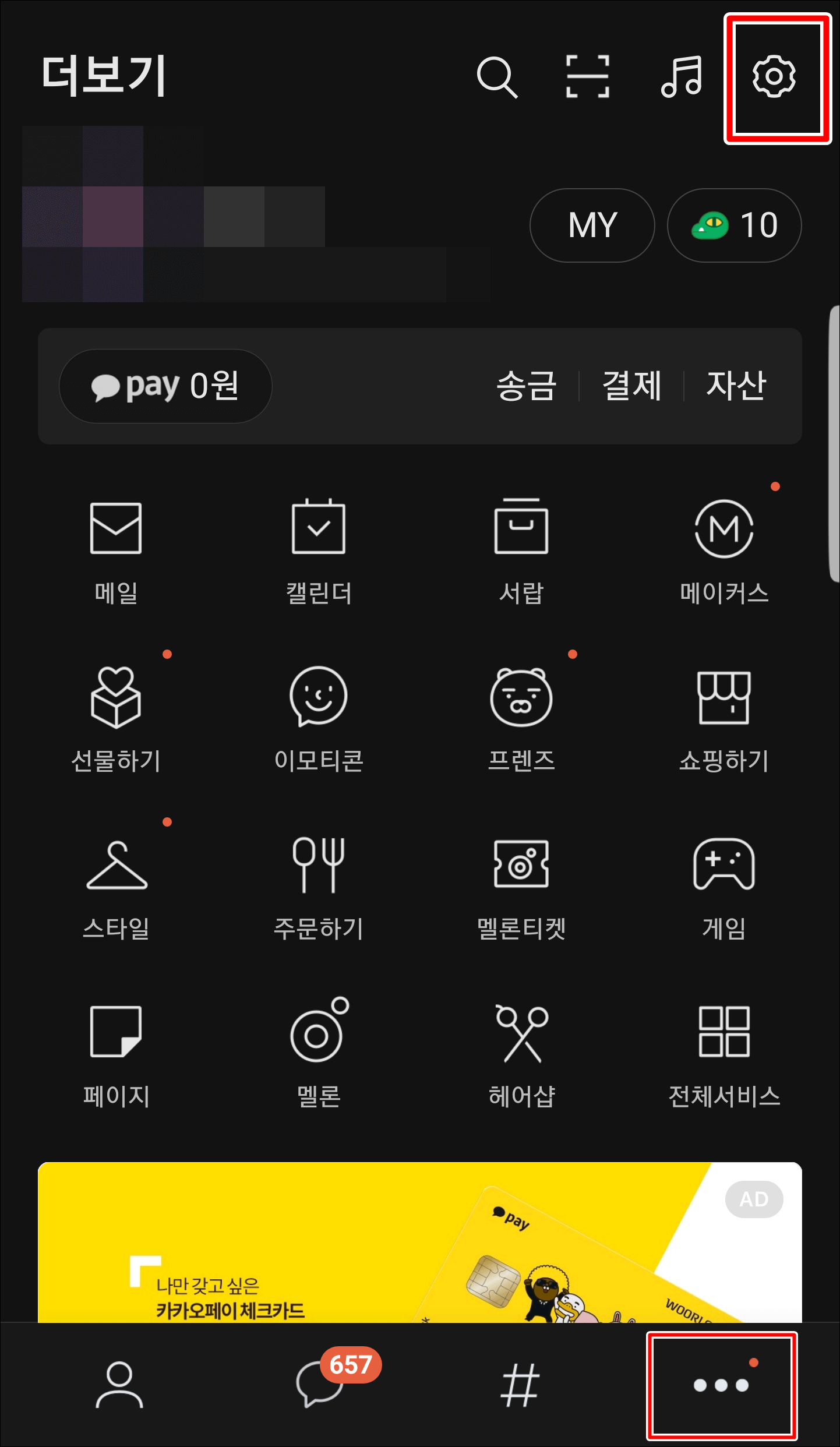 자 그럼 카카오 톡 메신저에서 백업과 대화 내용을 복구해보도록 하겠습니다. 먼저 우측 하단에 메뉴를 눌러주시고 상단에 톱니바퀴에 들어가서 채팅 탭을 눌러줍니다.