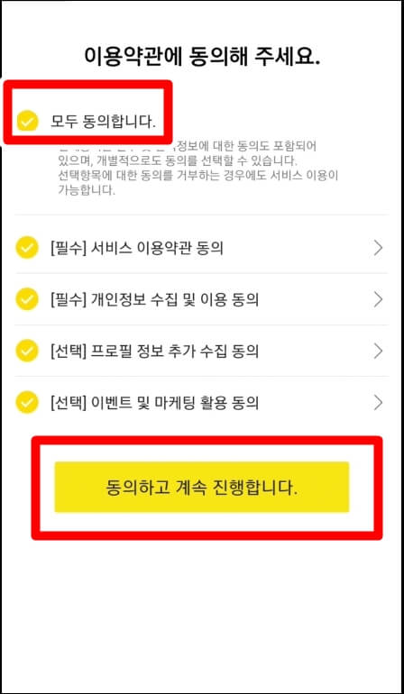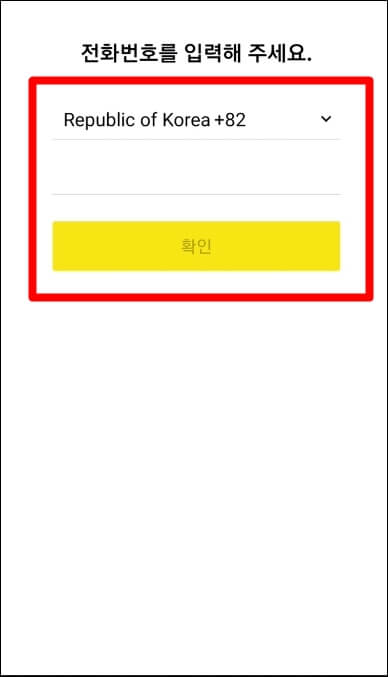 새로운 스마트폰에서 카카오 톡 메신저를 설치하고 로그인을 시도합니다. 데이터를 백업하고 어플을 삭제하기 전에 자신의 카카오톡 계정과 비밀번호, 그리고 데이터 백업 비밀번호를 수첩에 꼭 적어놓으시길 바랍니다. 이용약관에 모두 동의를 해주시고 동의를 눌러주신 후 국가를 선택하고 전화번호를 입력하시고 확인을 눌러서 본인인증 절차를 거칩니다.