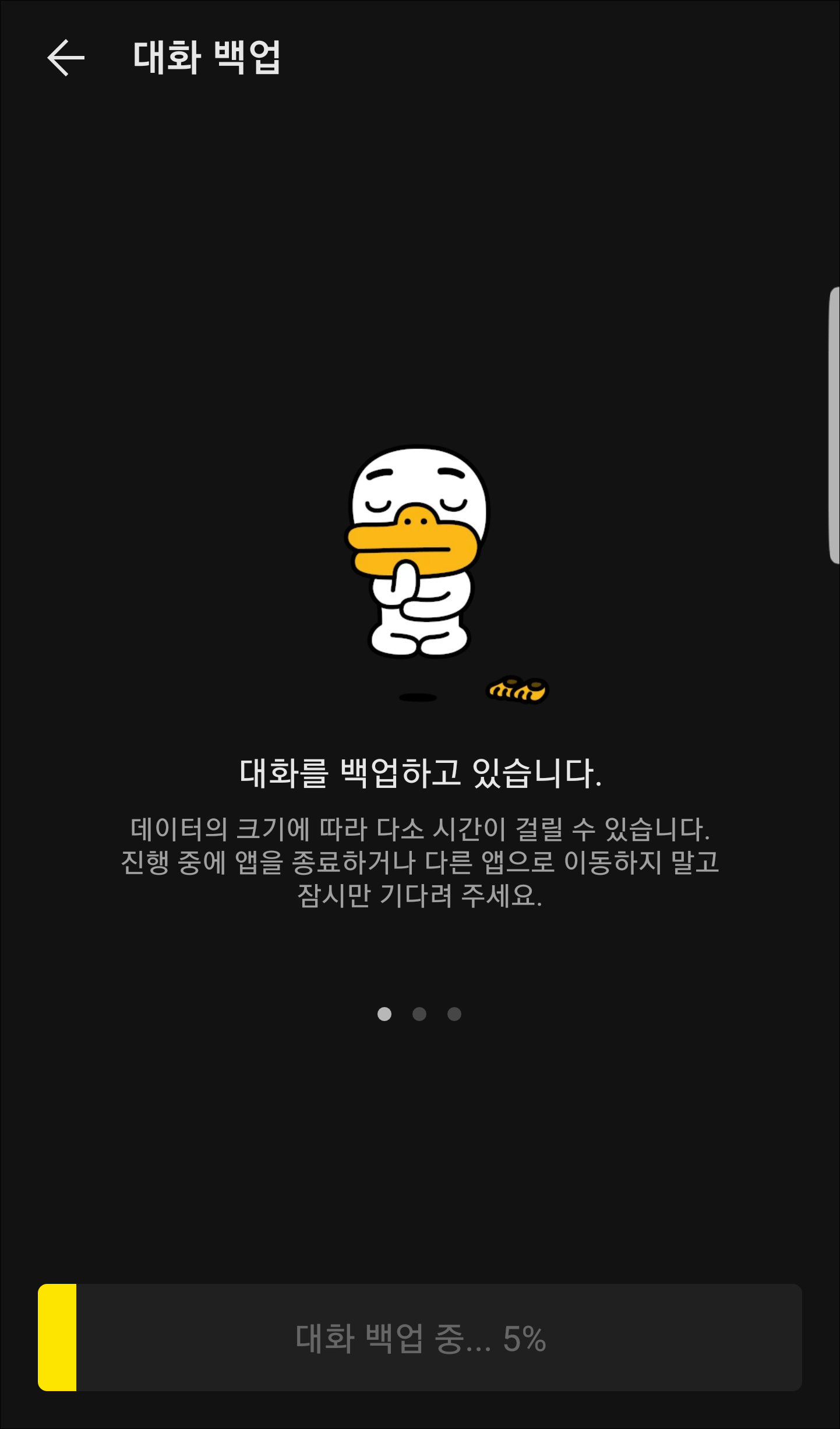 대화 백업이 진행 중입니다... 30~1분 정도면 모든 대화가 백업이 됩니다. 자 그럼 새로운 스마트폰을 구입했다고 가정하고 로그인을 시도해보도록 할까요?