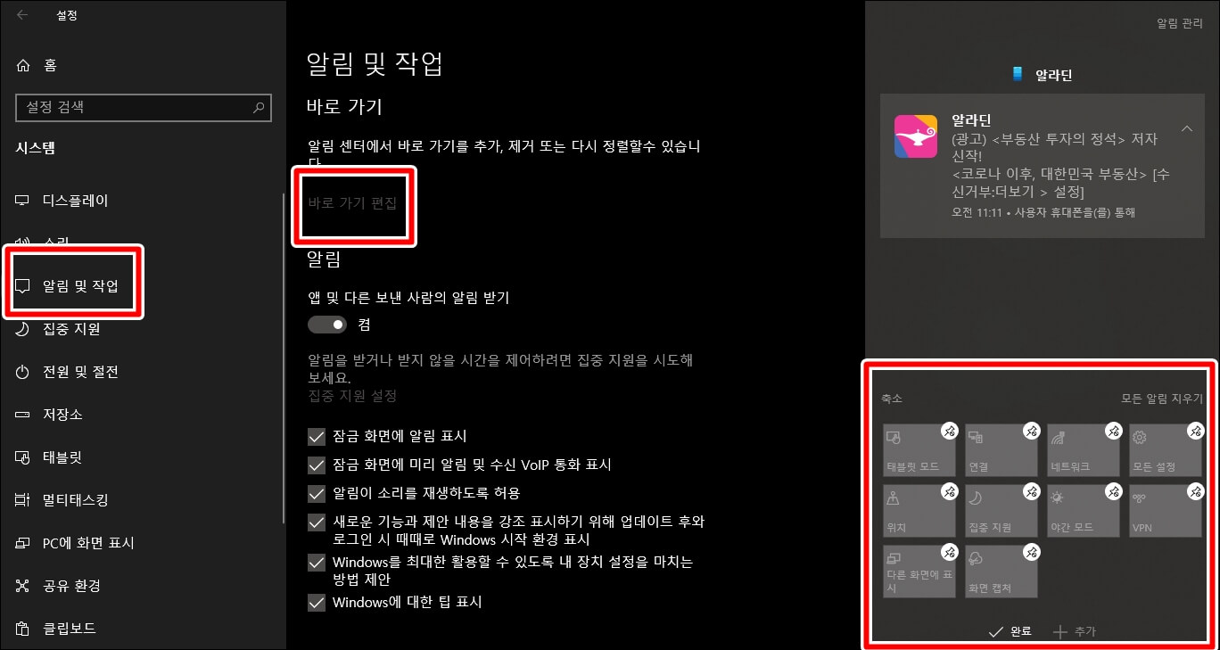 좌측에 알림 및 작업 탭을 클릭하시고 바로 가기 편집을 클릭하시면 아래와 같이 알림 창 편집 작업을 할 수 있는데요. 현재 제 컴퓨터에는 10개의 알림 창이 설정되어 있습니다. 컴퓨터에서 자동으로 업데이트할 때나 스마트폰에서 일어나는 모든 작업이 알림 창을 통해 나오게 되죠.
