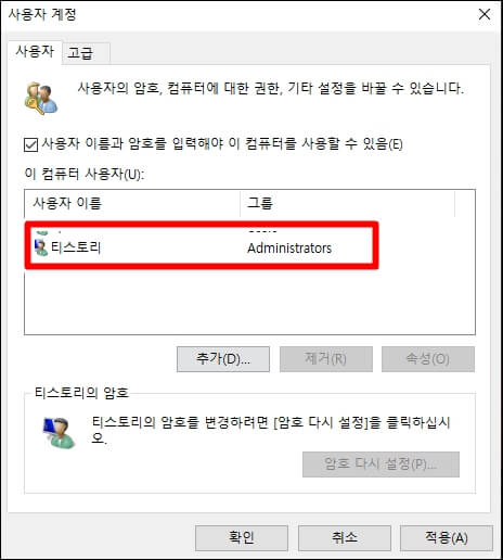 사용자 이름에 자신이 원하는 이름을 입력합니다. 저는 pc에서 티스토리로 입력해 보겠습니다. 입력하셨으면 적용을 누르신 후 확인을 클릭합니다.