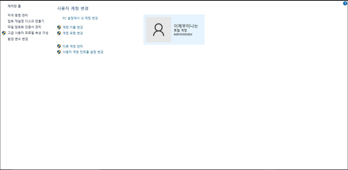 이 탭에서는 계정 변경, 사용자 계정 컨트롤 설정 변경 등 계정에 관한 설정을 할 수 있습니다. [계정 이름 변경]을 클릭합니다.