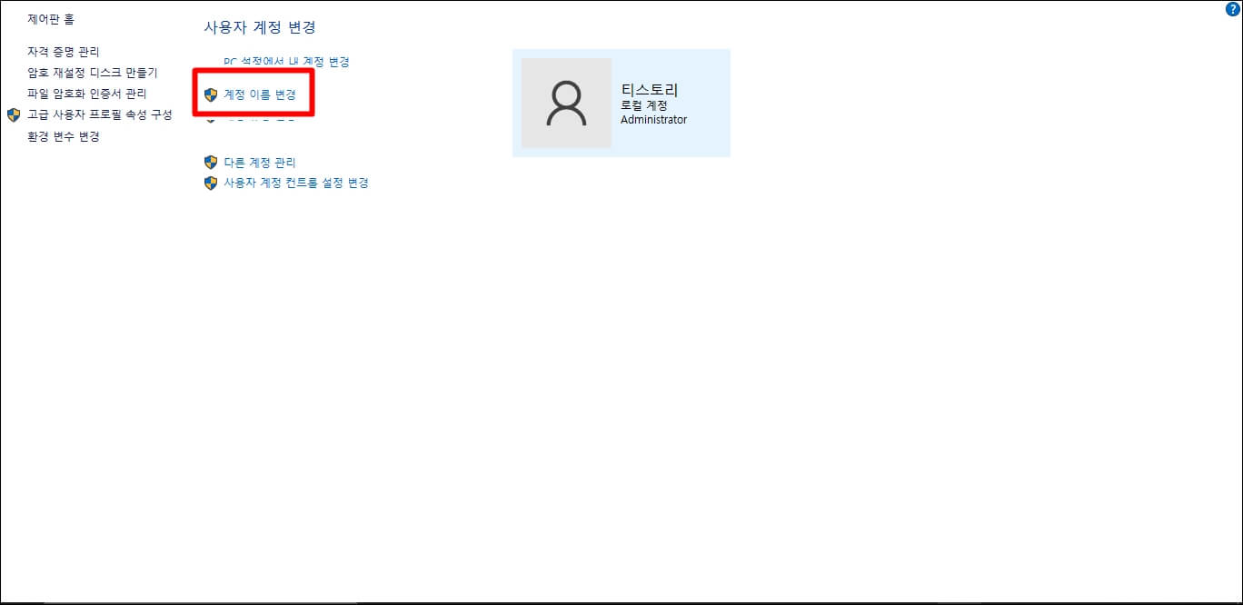 이 탭에서는 계정 변경, 사용자 계정 컨트롤 설정 변경 등 계정에 관한 설정을 할 수 있습니다. [계정 이름 변경]을 클릭합니다.