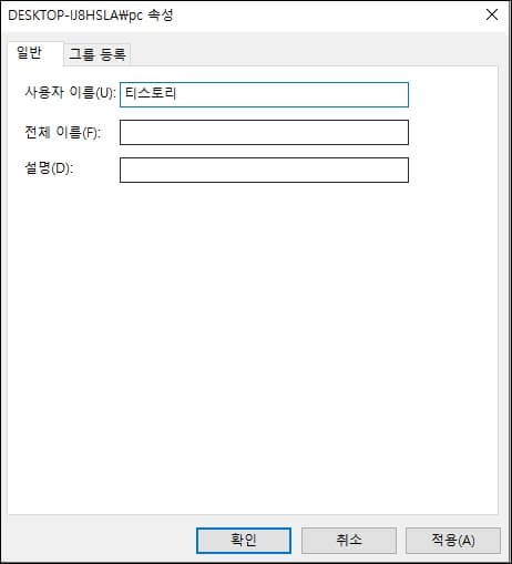 사용자 이름에 자신이 원하는 이름을 입력합니다. 저는 pc에서 티스토리로 입력해 보겠습니다. 입력하셨으면 적용을 누르신 후 확인을 클릭합니다.