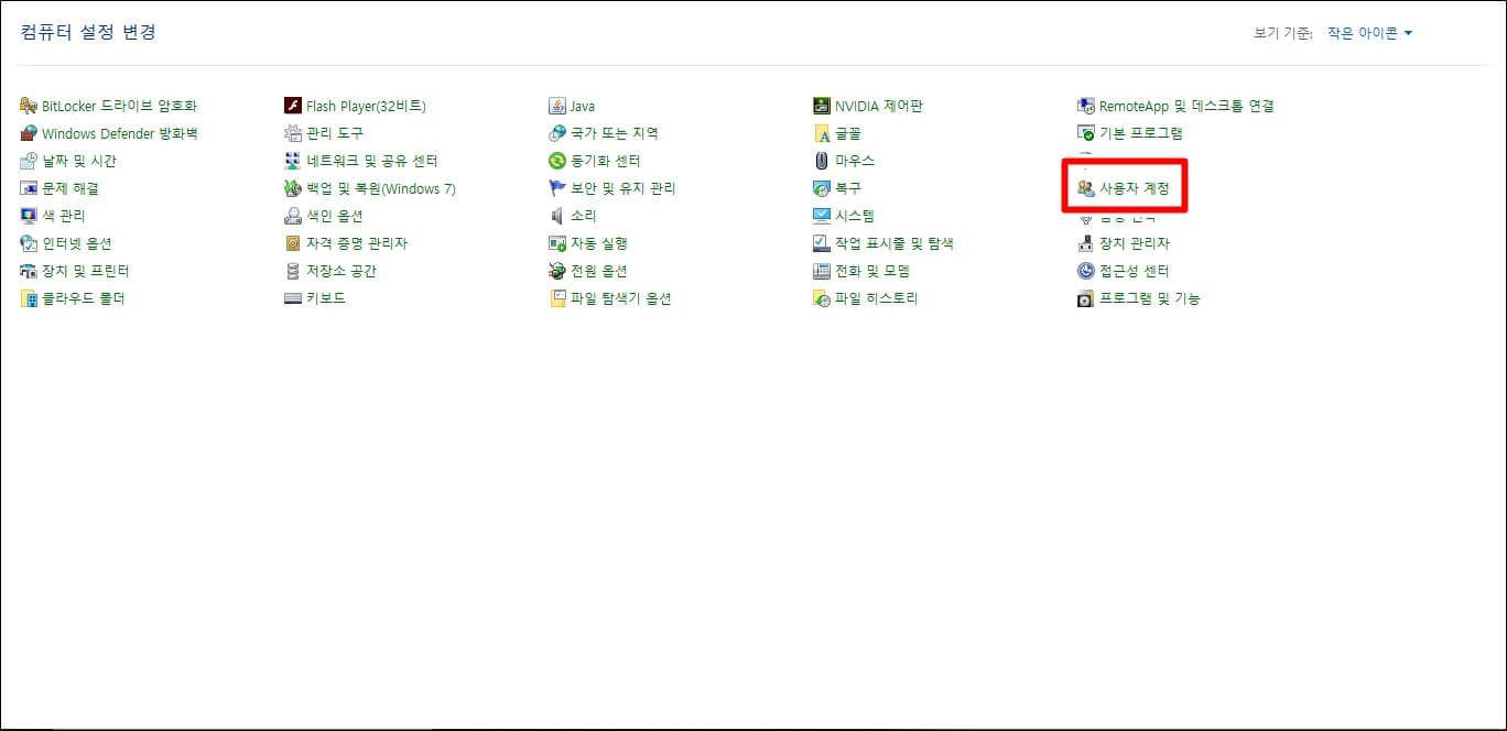 우측 상단에 보기 기준을 작은 아이콘으로 맞추시면 아래와 같이 사용자 계정이라는 탭이 뜨는데요.. 이 탭을 클릭합니다.