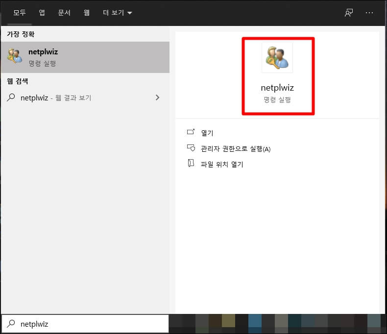 다음 방법으로는 사용자 계정 관리 창을 사용한 방법입니다. 처음과 같이 작업표시줄 좌측 아래 검색창에 netplwiz를 입력하시고 명령을 실행합니다.