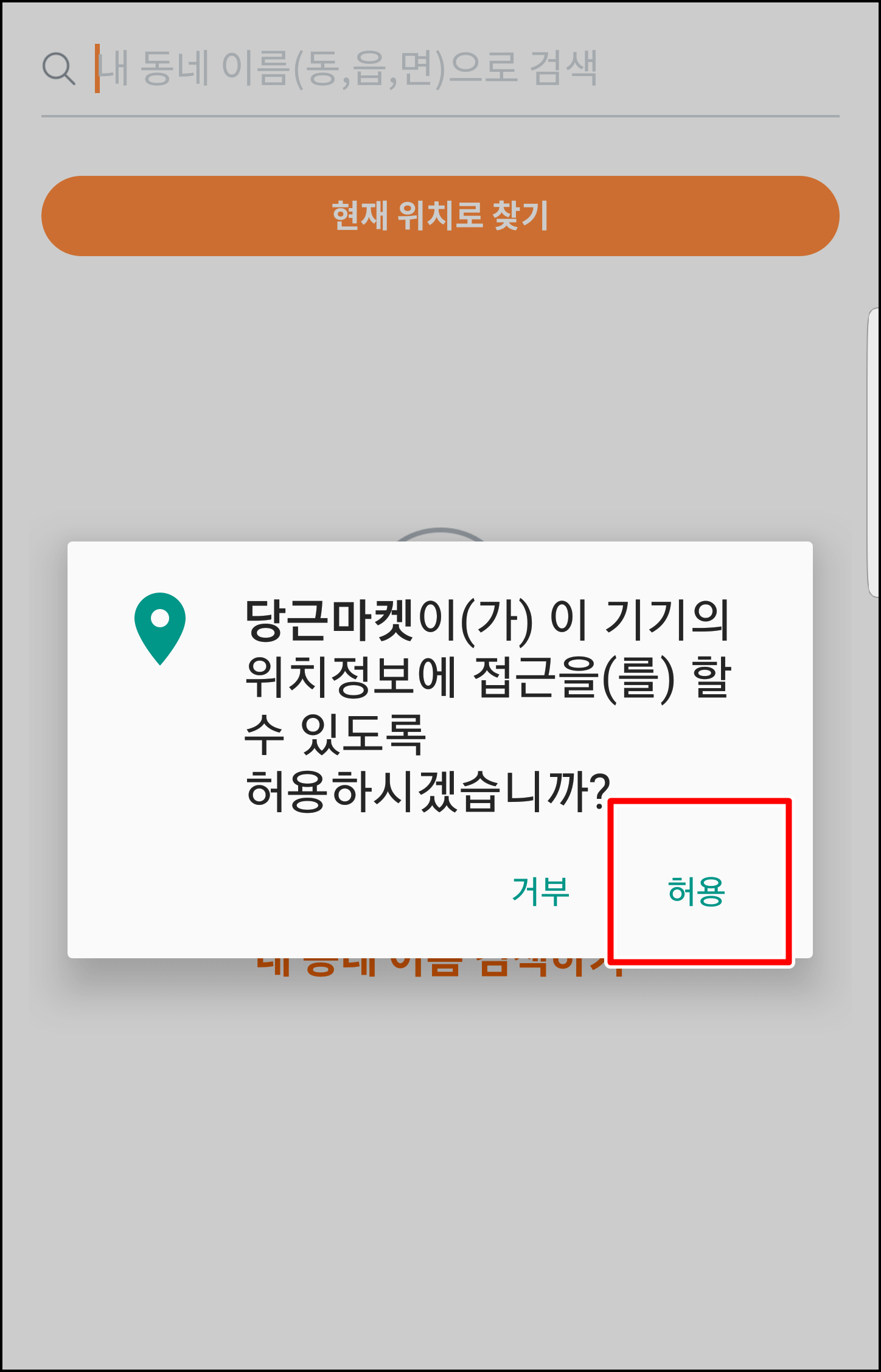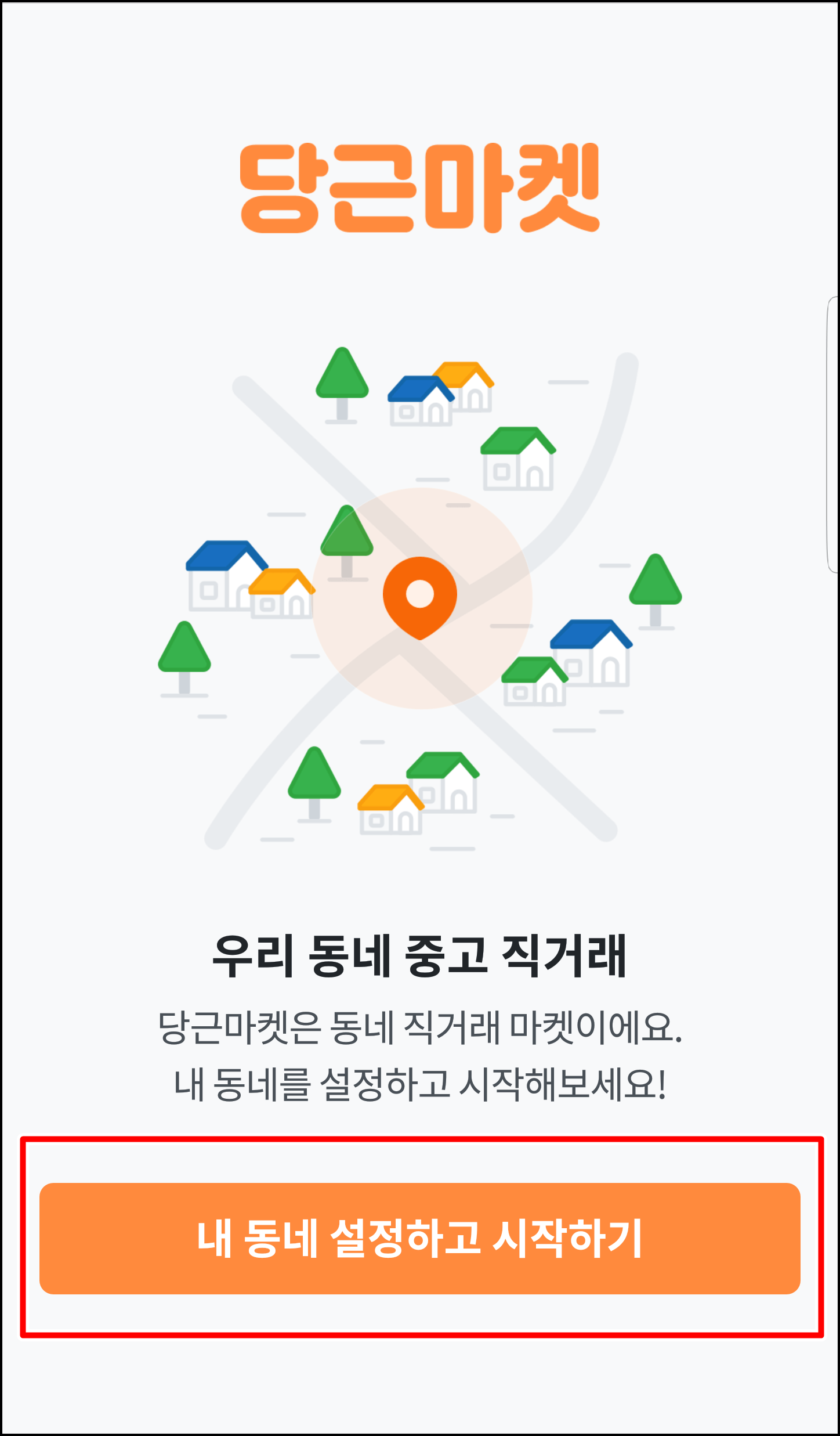 중고거래를 위해서는 회원 가입을 해야 하는데요.. 회원 가입은 별도의 아이디 없이 핸드폰 번호만으로 가입이 가능합니다. 설치를 하시고 앱을 클릭하시면 먼저 [내 동네 설정하고 시작하기]를 누르시고 권한을 허용합니다.