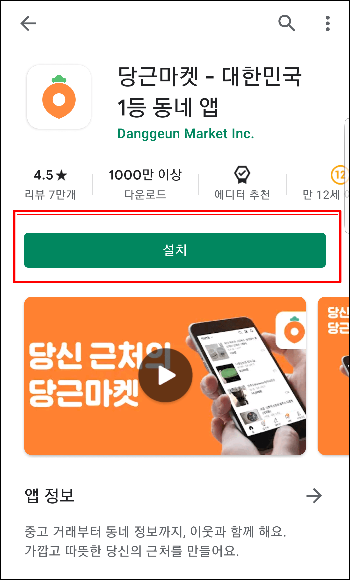 하루에 1인당 평균 20분을 사용하며, 한 달에 월 24회를 접속할 만큼 오고 가는 유저들이 많은 편입니다. 동네 상점 또한 9만 곳을 돌파했을 만큼 많은 상점이 있으며 영국, 캐나다 등 해외에도 적극적으로 진출하여 많은 사람들에게 서비스를 제공하고 있습니다. 이렇게 유저들의 사용률이 높은 이유는 당근 마켓 마케팅 전략 때문이라고 하는데요... 아무래도 직거래 위주의 거래다 보니 사건사고가 다른 앱 보다 적다고 하죠! 그럼 직접 어플 설치하고 가입해서 물건을 올려보도록 하겠습니다.