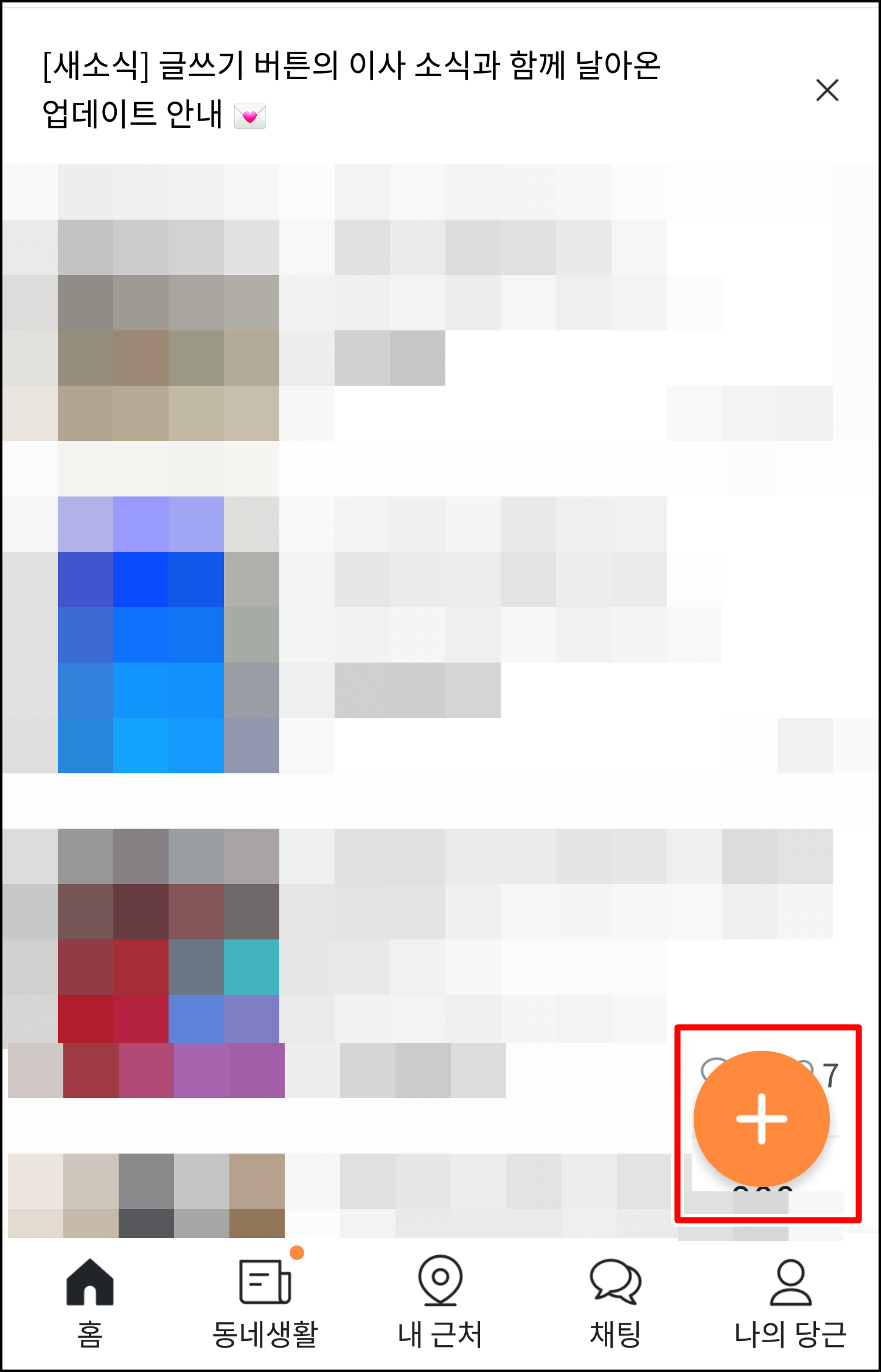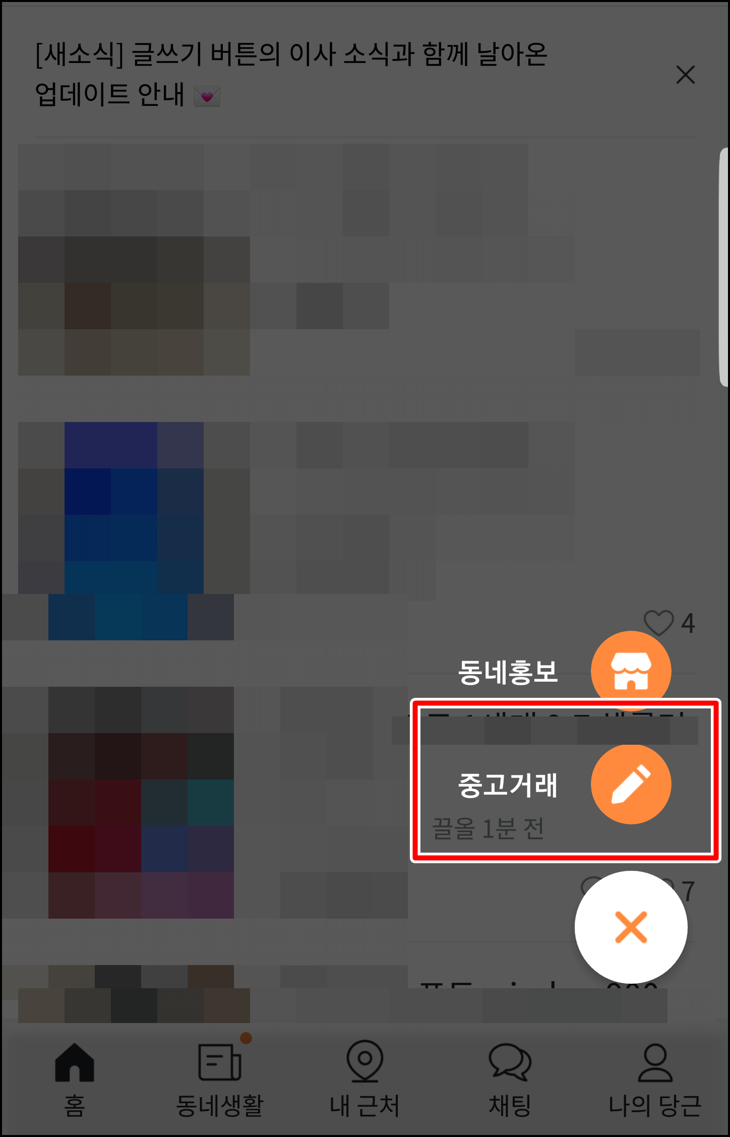처음 가입하면 접속해보면 현재 같은 동네에 거주하는 사람들이 올려놓은 중고물품이 업로드됩니다. 자 그럼 제 물품도 한번 올려봐야겠죠?? 우측 하단에 +를 누르신 다음 [중고거래]를 눌러봅니다.