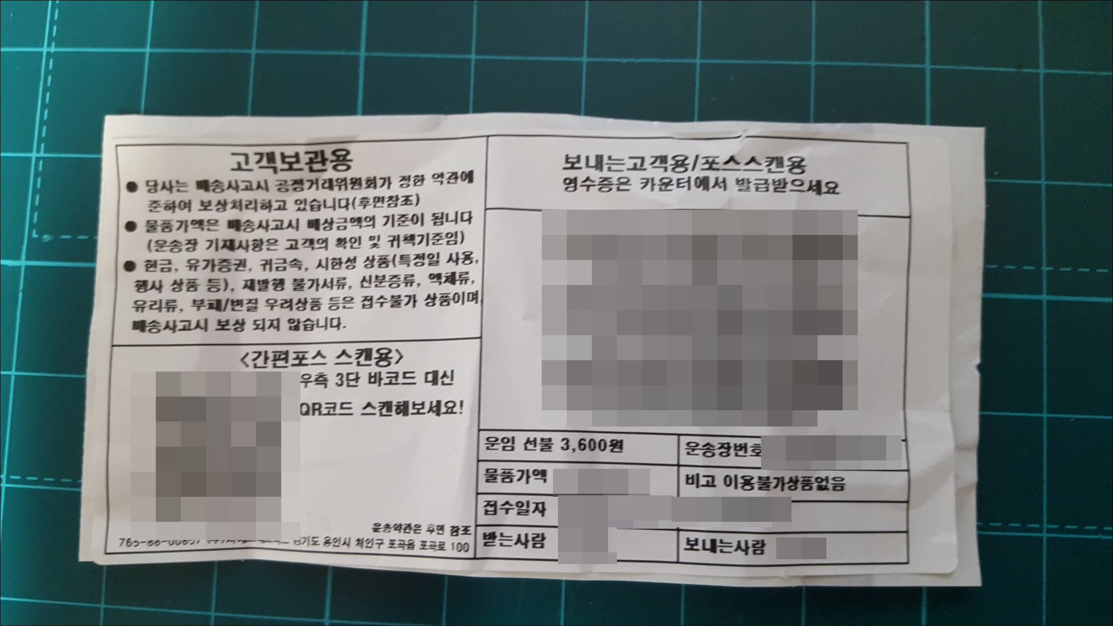 물건을 택배로 판매하고 받은 택배 영수증입니다. 이렇게 택배 거래를 하셔도 되고 직접 만나서 거래를 하셔도 되지만 웬만하면 직거래를 추천드립니다. 왜냐하면 물건의 상태를 정확히 봐야 구매할지 안 할지를 결정할 수 있기 때문이죠. 보통 판매자들은 한번 구매하면 환불이 불가하다는 거래 조항을 항상 넣기 때문에 조심해서 구입하셔야 합니다.