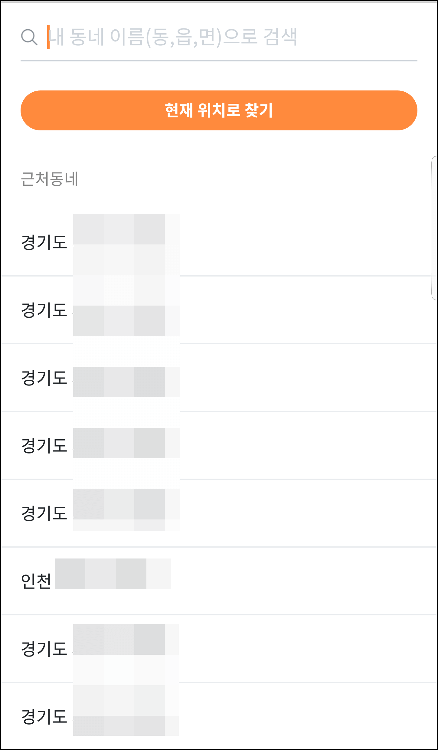 그럼 GPS로 현재 위치를 파악하여 근처 동네를 제공해 주는데요... 여기서 자신이 거주하는 지역을 정확하게 선택하시고 회원가입/로그인 절차를 진행합니다. 인증문자 받기를 눌러봅니다.