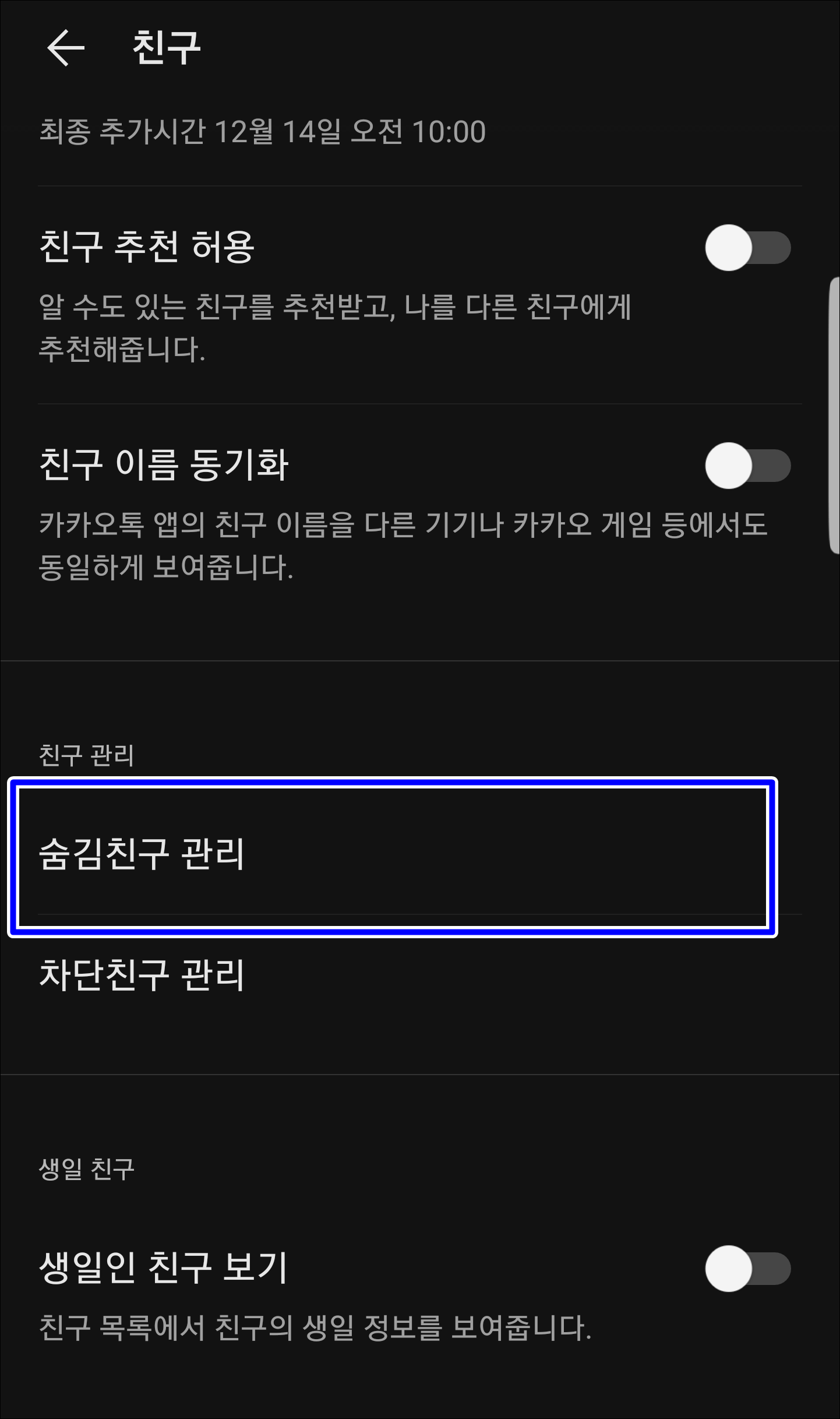 친구 관리 탭에서 숨김 친구 관리를 눌러서 들어가 보면 지금까지 제가 숨겼던 사람들의 목록을 볼 수 있습니다. 그럼 차단을 실행해 보도록 하죠.