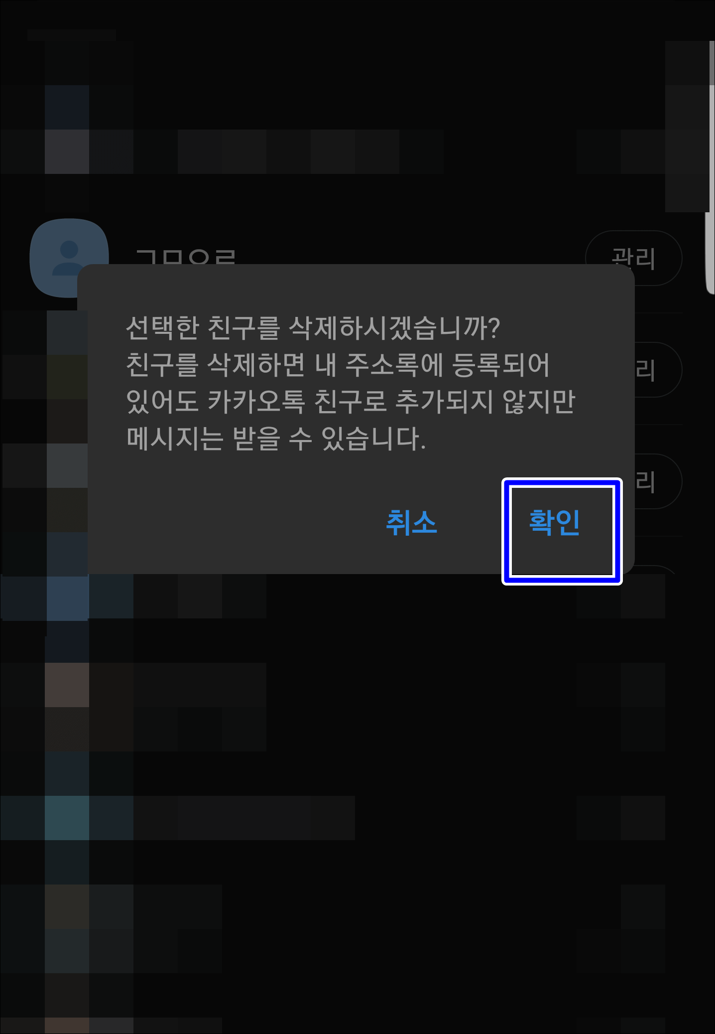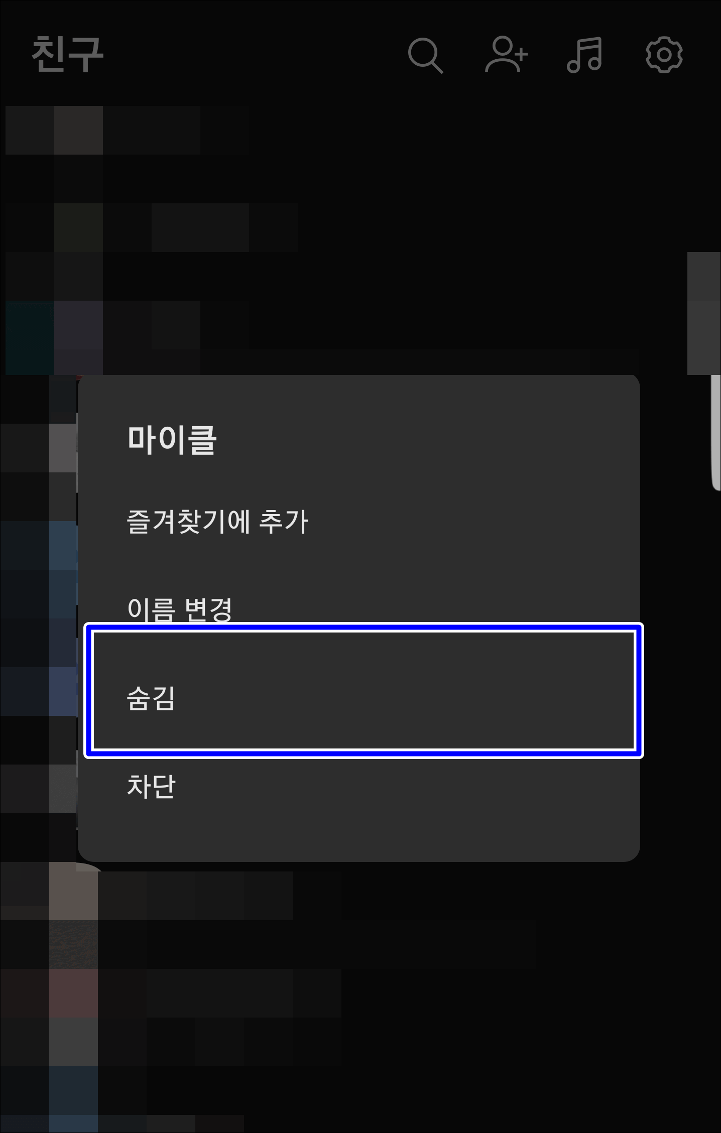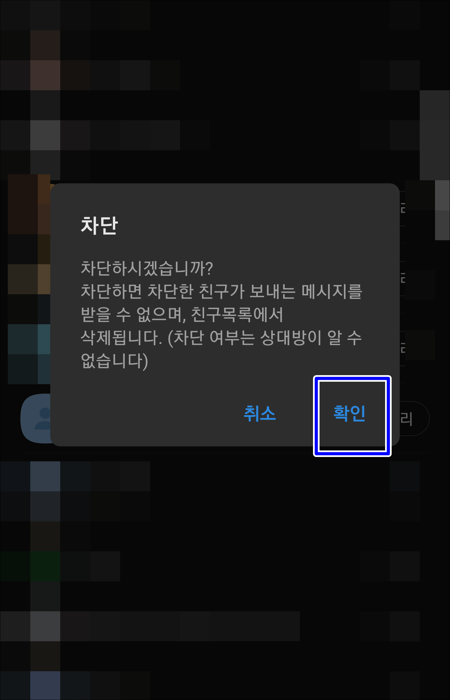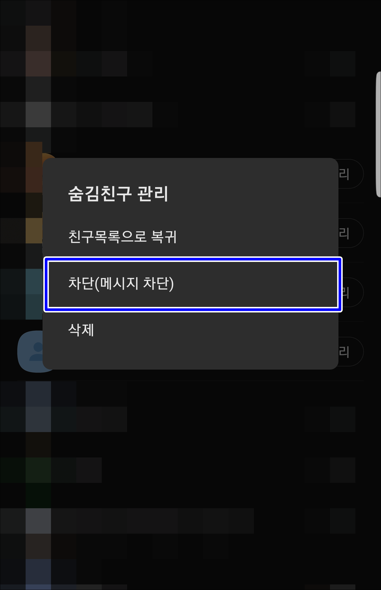 단순히 숨김 기능으로 만족을 못하시겠다면 차단과 삭제 기능을 추가로 할 수 있습니다. 숨겨진 친구를 누르고 있으면 친구 목록으로 복귀, 차단(메시지 차단), 삭제 옵션이 뜨는데요.. 여기서 차단을 눌러봅니다.