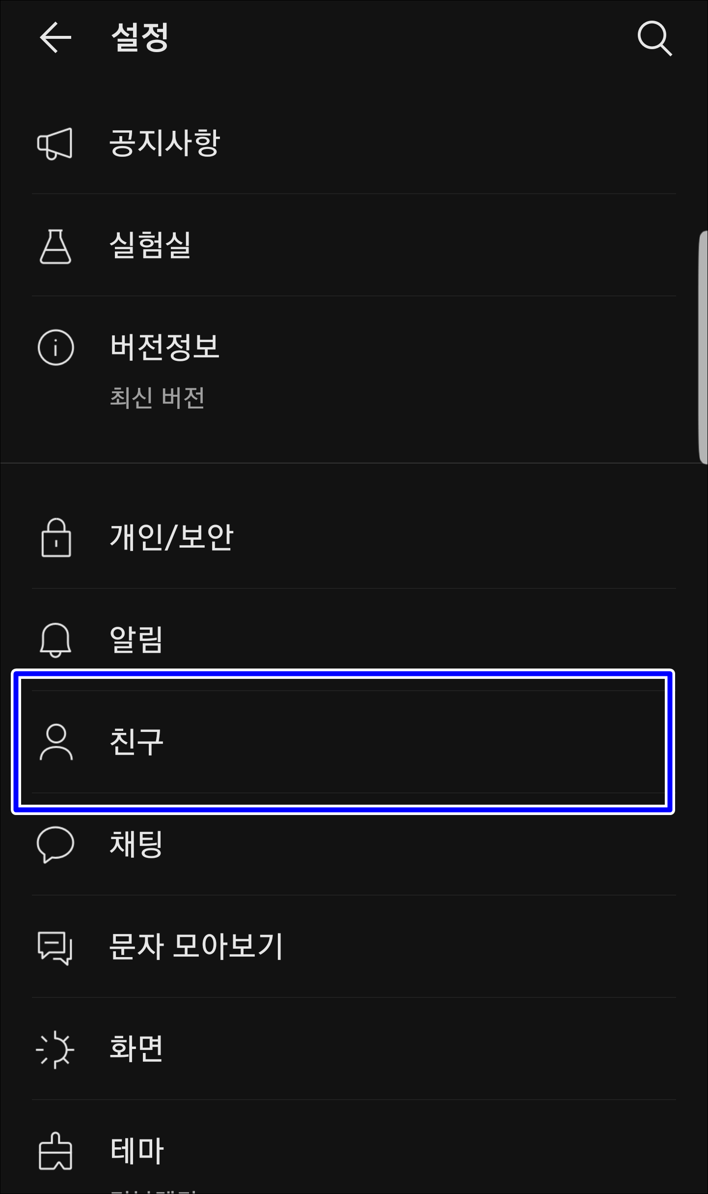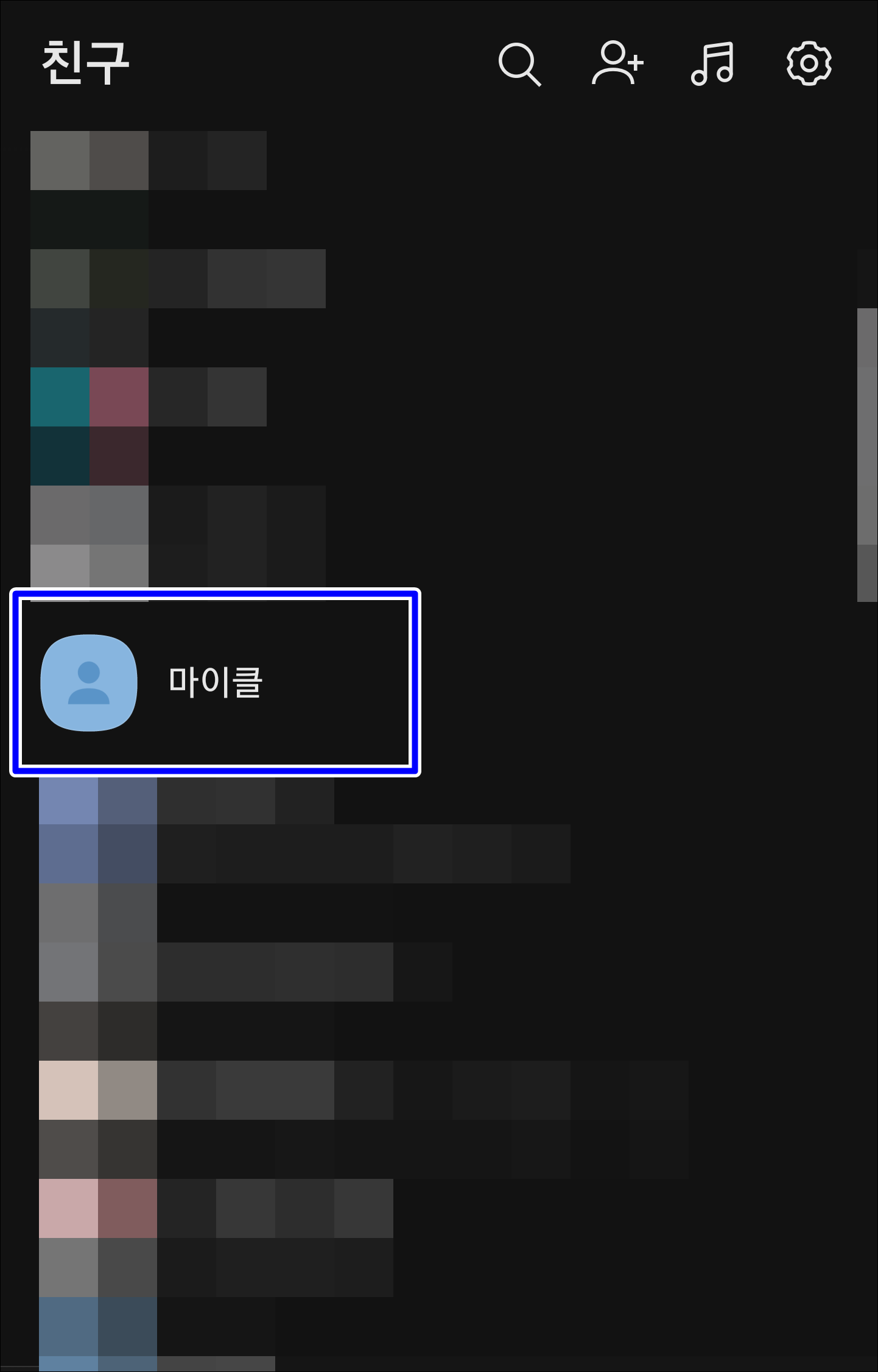 우측 아래 메뉴를 누르신 후에 상단에 톱니바퀴를 누르시고 친구 탭으로 접속해봅니다.