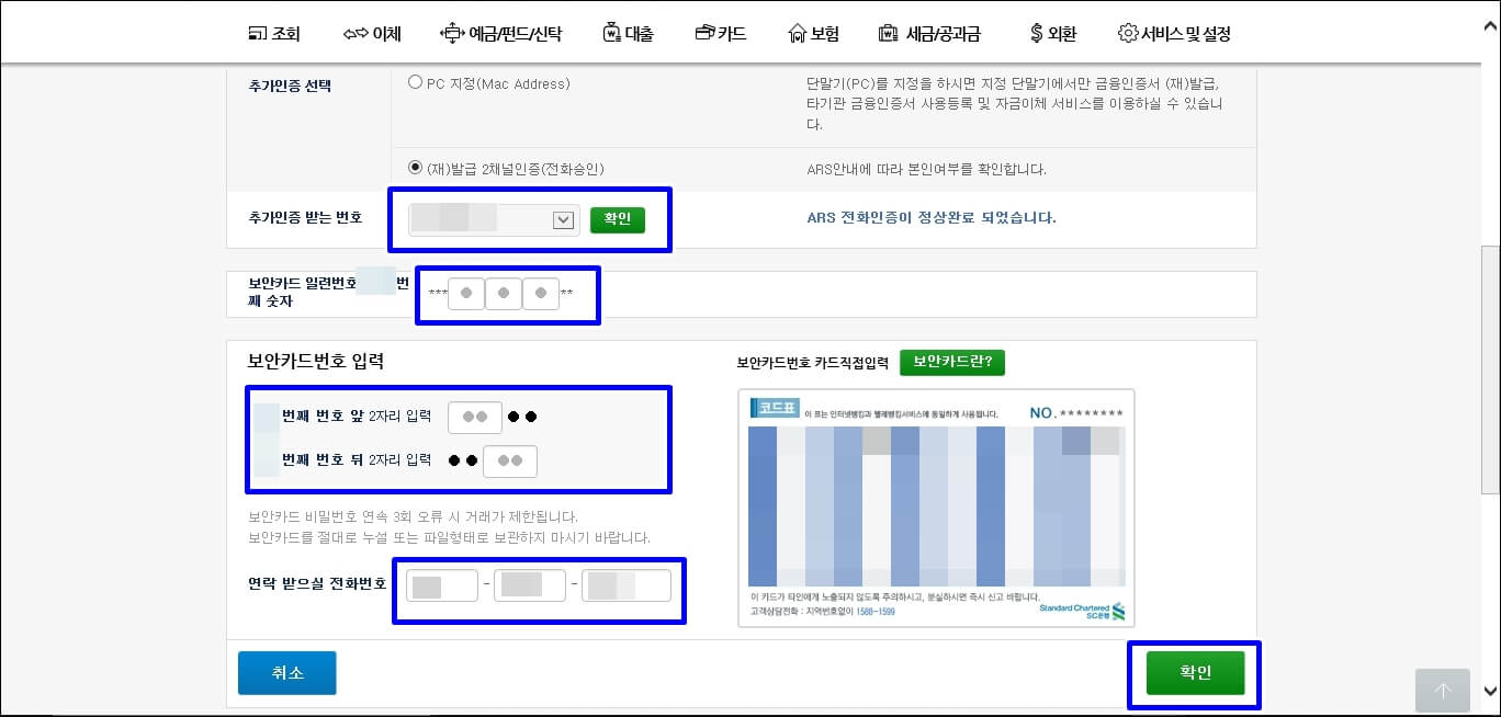 추가 인증 선택에서 2 채널 인증(전화인증)을 선택하신 후 추가 인증받는 번호를 입력하셔서 ARS 전화인증을 진행하시면 보안카드 입력란에 생성됩니다. 여기서는 일련번호 3자리, 보안카드번호 등을 입력하시고 연락받으실 전화번호를 입력합니다. (시크릿 카드가 없으면 발급 불가 X)