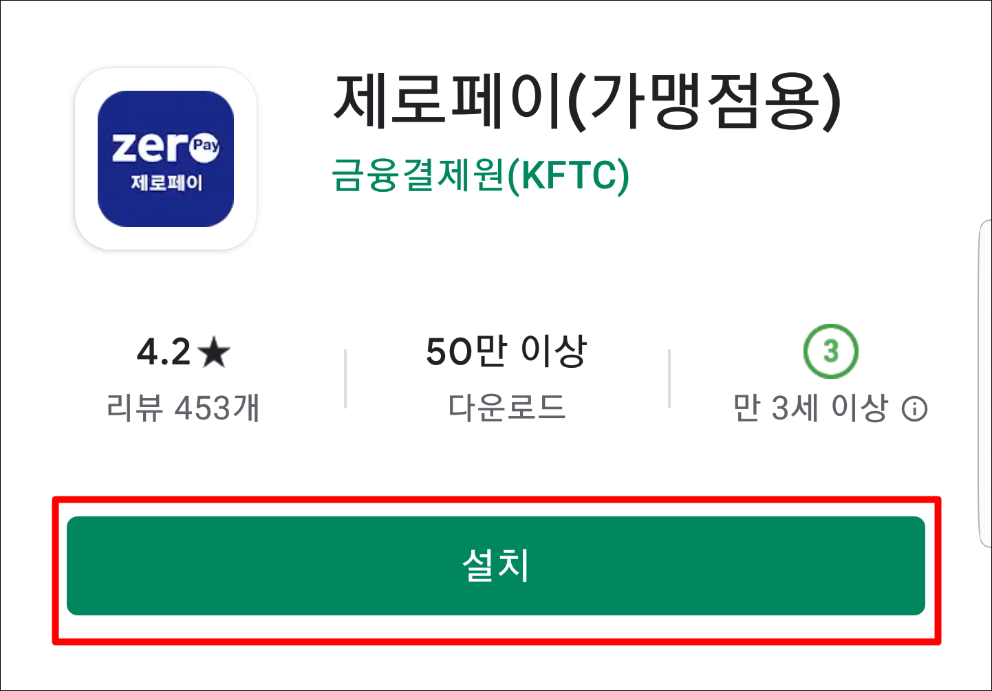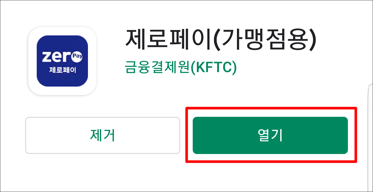 PC에서 가입할 수 있는 환경이 아니면 모바일로도 가입이 가능합니다. 플레이 스토어에서 제로 페이(가맹점용)를 검색하시고 설치하신 다음 열기를 클릭합니다.