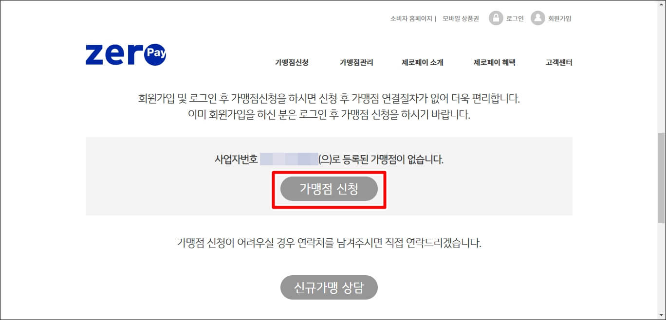 그럼 사업자번호가 가맹점에 가입되어 있는지 조회가 이루어지는데요.. 가맹점에 가입이 안 돼있다면 아래와 같이 가맹점 신청을 클릭할 수 있는 탭이 뜰 것입니다. 이 탭을 클릭해서 가맹점 신청을 진행하시면 됩니다. 이 이상으로는 보안 문제 때문에 따로 다루지는 않겠습니다.