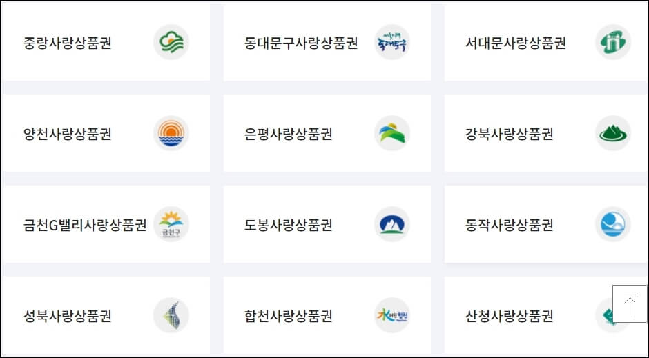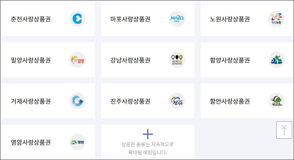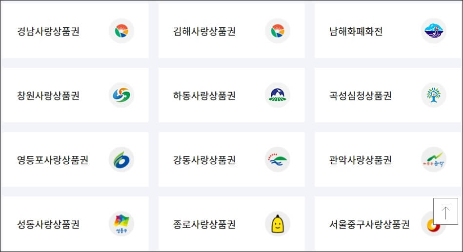 경남사랑 상품권, 김해사랑 상품권, 남해 화폐 화전, 중랑사랑 상품권, 동대문구 사랑 상품권, 서대문사랑 상품권, 창원사랑 상품권, 곡성심청상품권, 양천사랑 상품권, 은평사랑 상품권, 강북 사랑 상품권, 영등포 사랑 상품권, 강동 사랑 상품권, 관악사랑 상품권, 금천 G벨리 사랑 상품권, 도봉사랑 상품권, 동작사랑 상품권, 성동 사랑 상품권, 종로사랑 상품권, 서울 중구사랑 상품권, 성북사랑 상품권, 합천사랑 상품권, 산청사랑 상품권