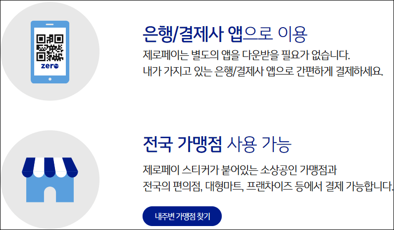 제로 페이는 전국의 4만 곳이 넘는 편의점뿐만 아니라 대형마트, 정육점, 꽃가게, 호프집, 일반식당, 정육점, 일식 식당, 치킨가게, 피자가게, 중소마트, 슈퍼 등 다양한 곳에서 사용이 가능합니다. 보통 가맹점들은 출입구 앞에 가맹점 스티커를 붙여놓기 때문에 쉽게 구분이 가능합니다.