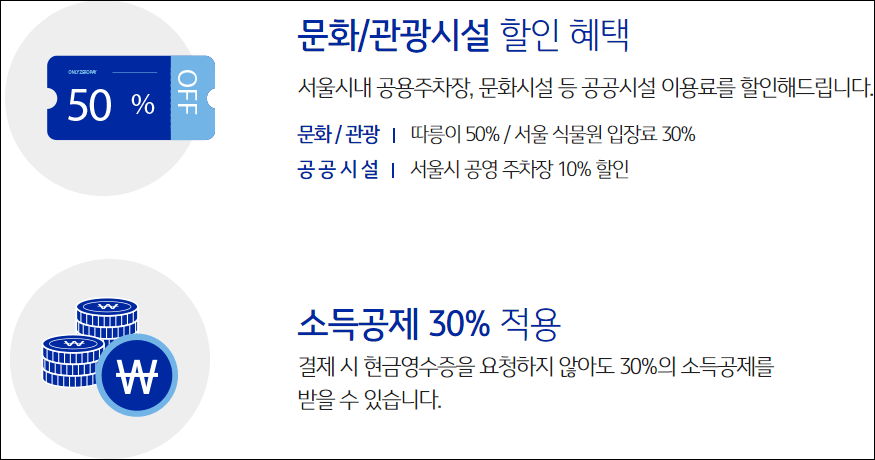 서울시내에 위치한 문화시설, 공용주차장, 공공시설 등 다양한 여가생활에서 할인 혜택이 주어집니다.