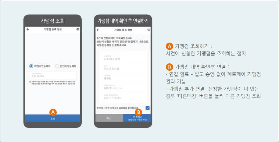 다음으로 가맹점 조회를 진행해 주시고 가맹점 내역 확인 후에 연결하기 위해 사업자번호, 이름, 주민번호, 휴대폰 번호 등 개인정보를 입력하시고 연결하기를 눌러줍니다.