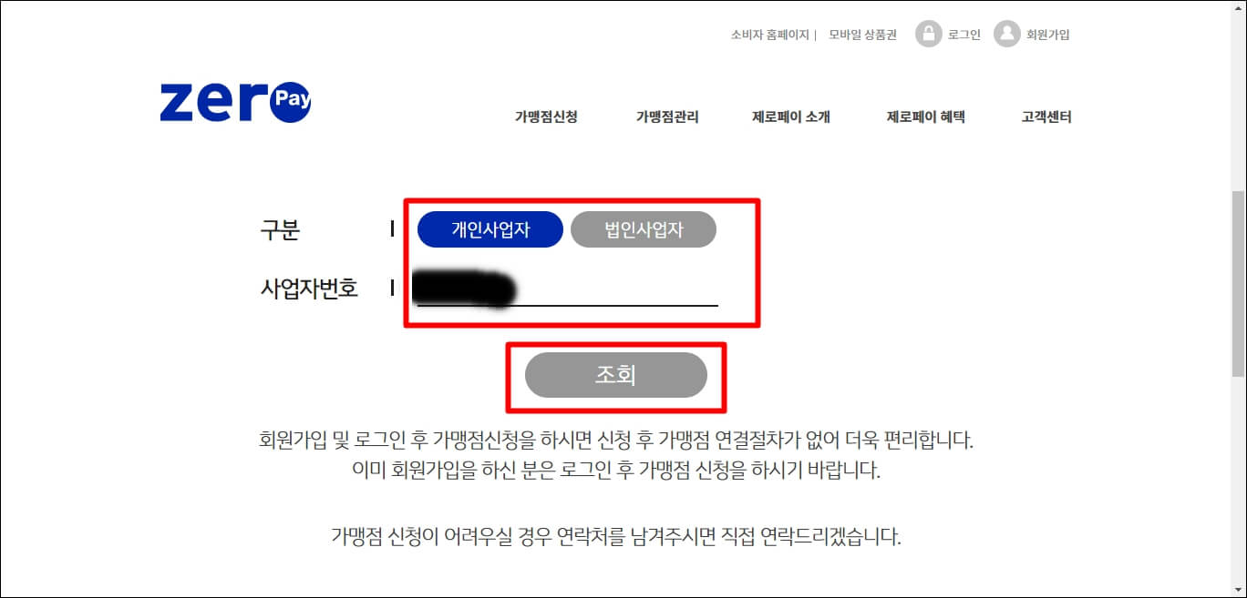 가맹점을 등록하기 위해서는 본인 명의로 된 사업자가 필요합니다. 사업자가 있으신 분들은 제로 페이 사이트에 접속하셔서 회원가입을 진행하시고 [가맹점 조회/신청]을 클릭합니다.