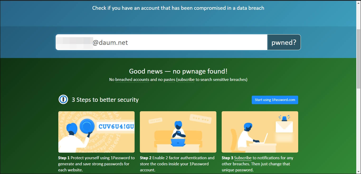 마지막으로 제가 다음에서 쓰는 메일을 입력해서 pwned를 눌러보았는데 역시 해킹 흔적이 발견되지 않았다고 뜨네요. 정말 다행입니다!!