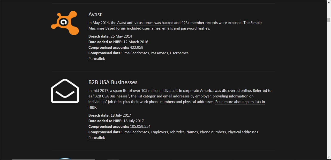 해당 탭에서는 그동안 개인정보가 유출되었던 사이트들의 정보가 나오는 곳인데요.. 도미노피자, 어도비, 어베스트 등등 세계적인 기업들의 개인정보 유출 사고를 기록해 놓고 있습니다. 보안업체라고 해서 개인정보 유출을 피해 갈 수 없다는 게 조금은 의외인 듯합니다. 어베스트는 2014년에 약 42만 개의 개인정보가 유출된 적이 있다고 나옵니다.