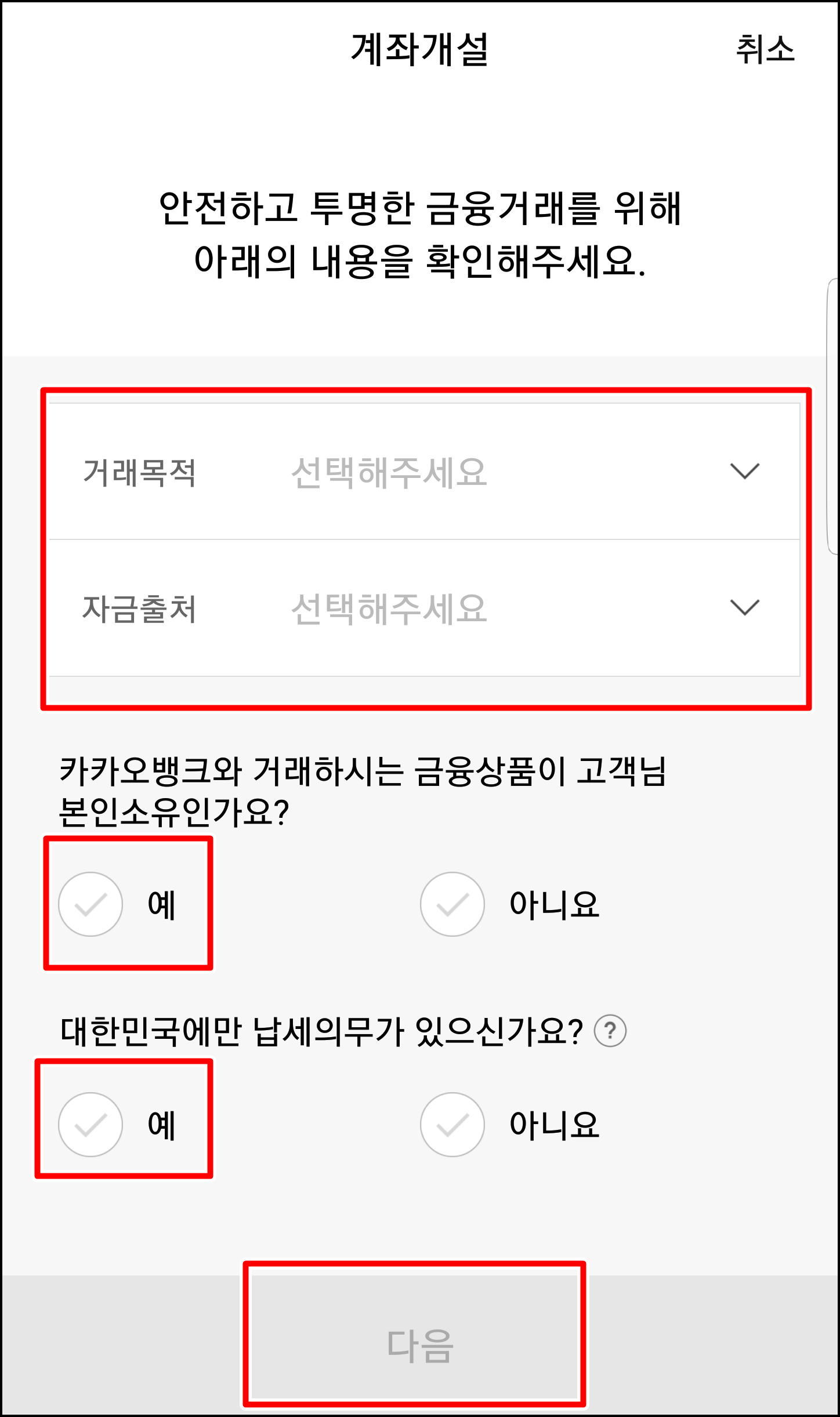 거래목적, 자금출처 등등 다양한 물음에 맞는 답을 체크하시고 통장 비밀번호를 입력하신 다음 계좌 사용용도 등을 입력해줍니다.