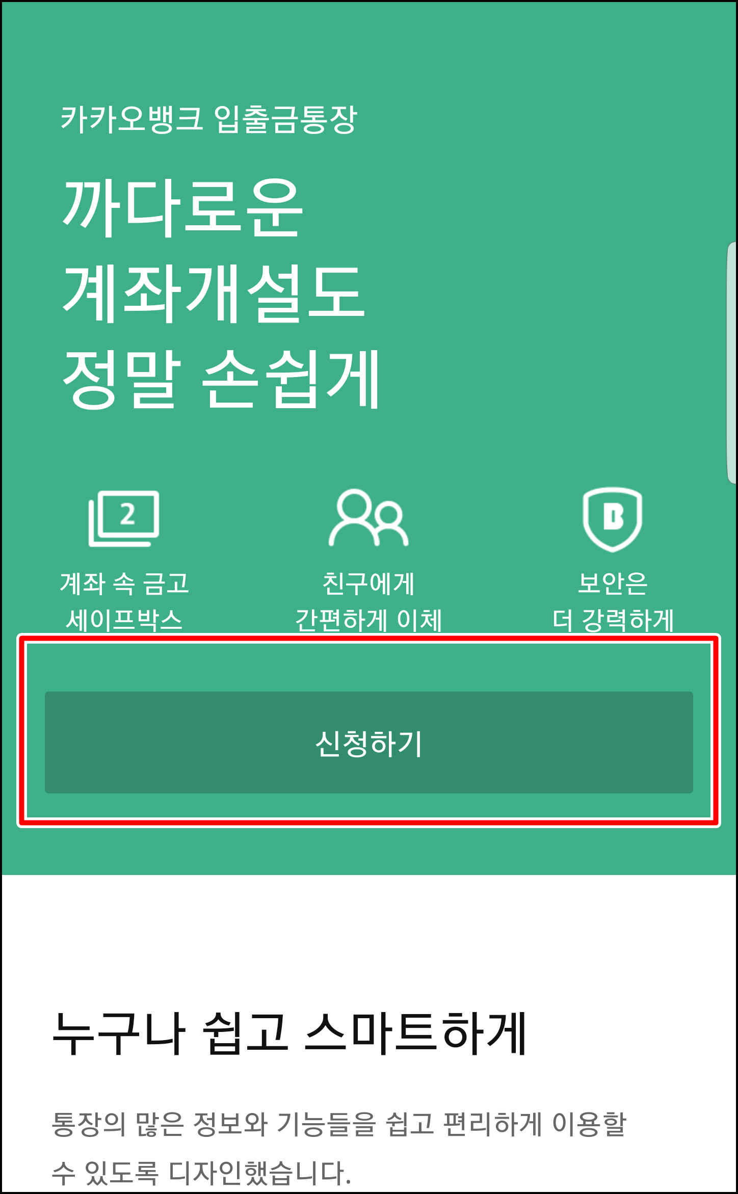카뱅 어플을 설치하신 다음 앱에 접속하셔서 노란색 상자에 있는 +계좌 개설하기를 누르시면 녹색창이 뜨는데요.. 여기서 신청하기를 눌러봅니다.