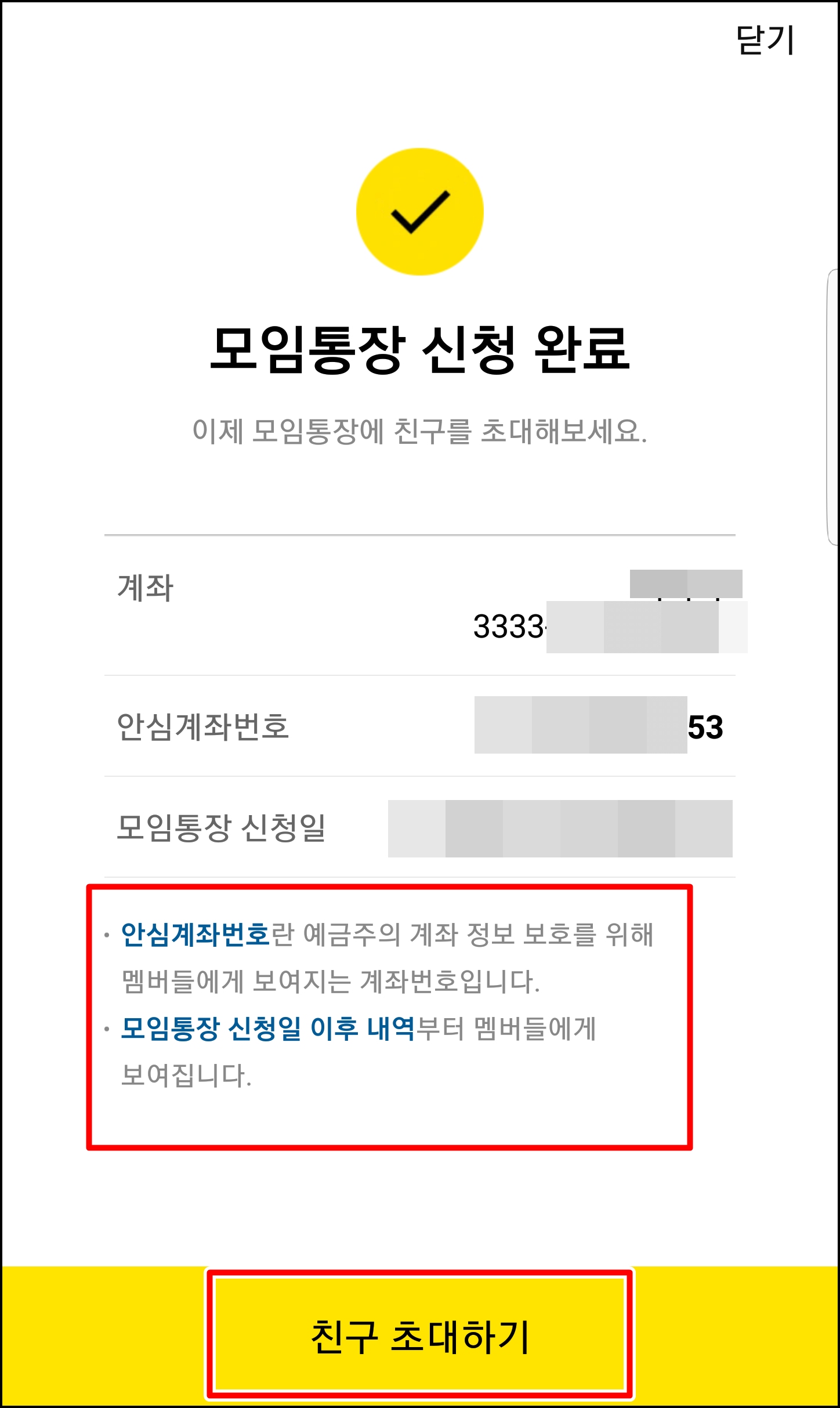 모임통장 신청이 완료되면 계좌, 안심 계좌번호, 모임통장 신청일 등 몇 가지 중요 정보가 뜹니다. 일단 모임 통장은 계좌가 333으로 시작하며 보안을 위해 안심 계좌번호를 발급하고 있으니 참고해 주세요.
