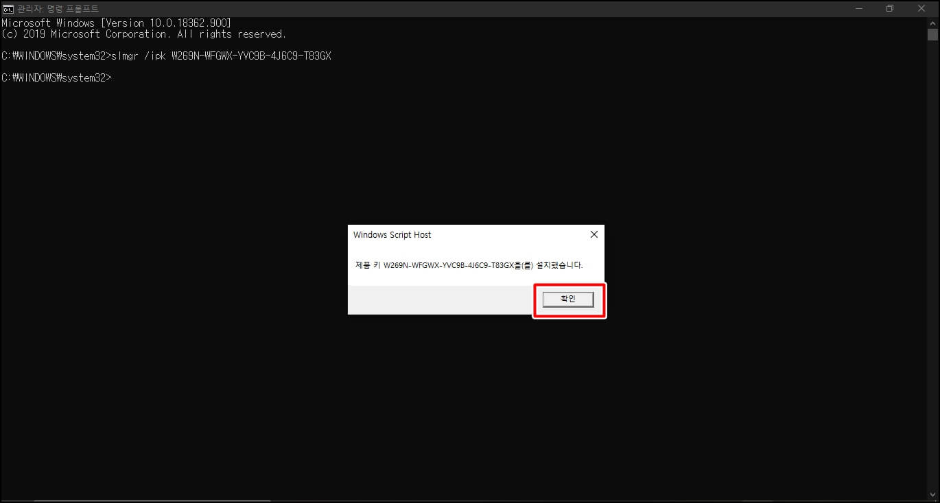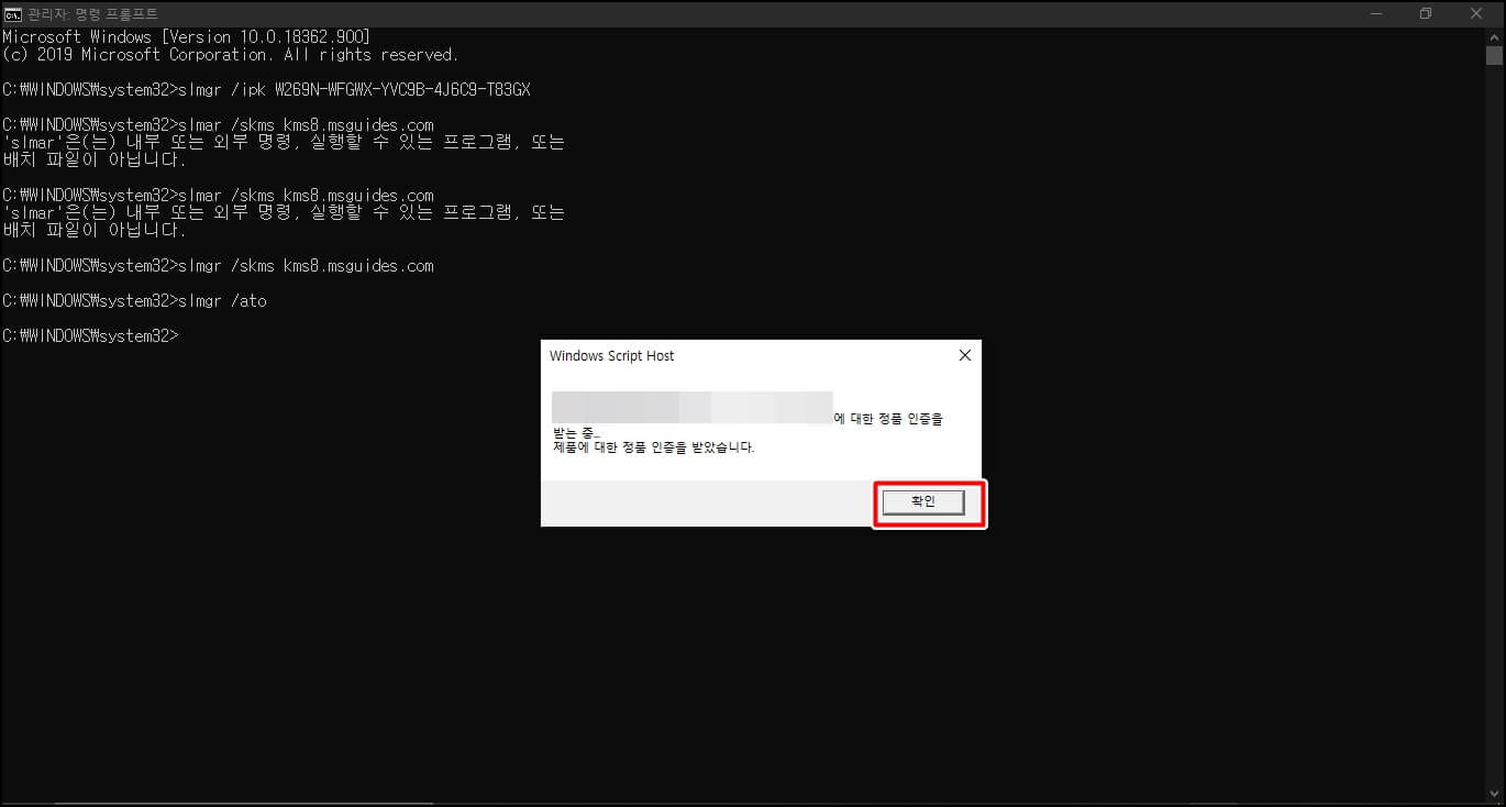 slmgr /ato 를 입력하셔서 연결했었던 KMS서버에서 정품 인증을 받으시고 확인을 클릭하면 모든 인증 절차가 끝납니다.