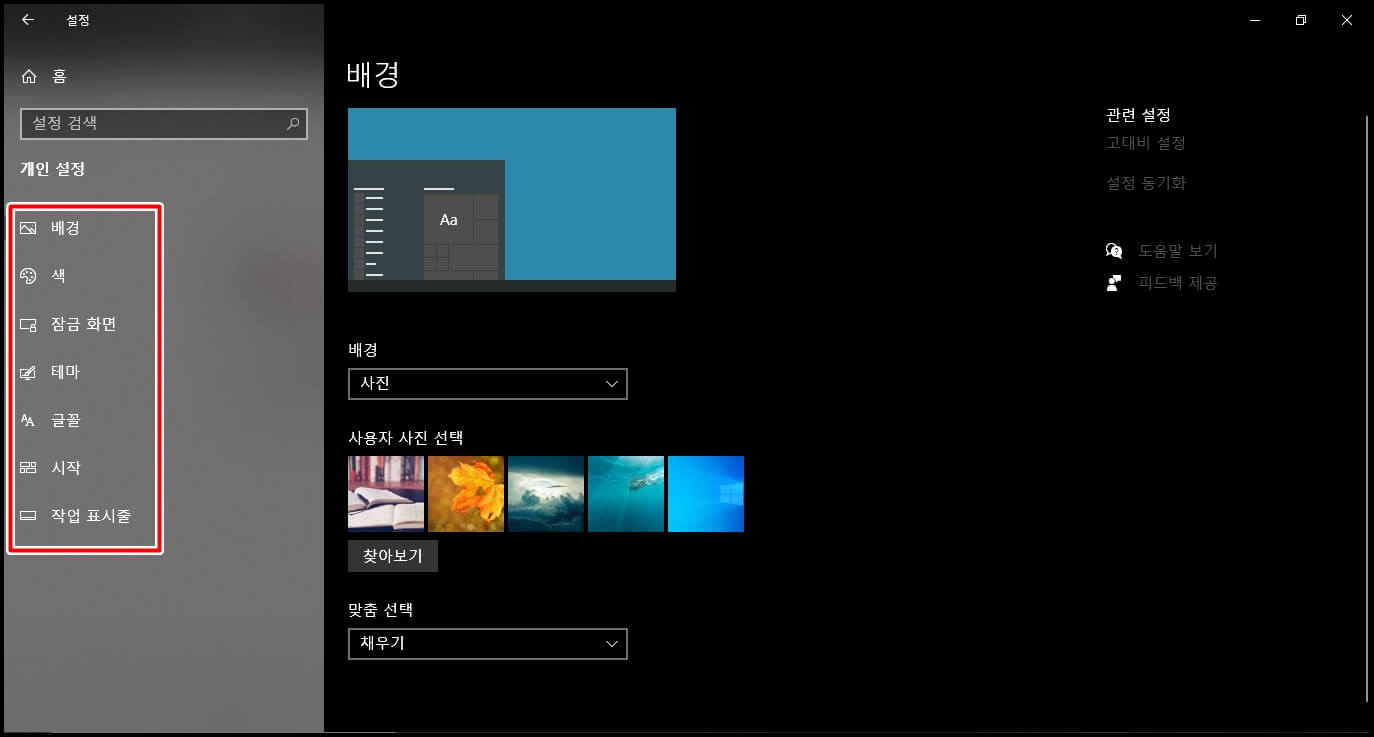 개인 설정에 있는 배경, 색, 잠금 화면, 테마, 글꼴, 시작, 작업 표시줄 등의 기능을 변경할 수 없으니 참고하시길 바랍니다.
