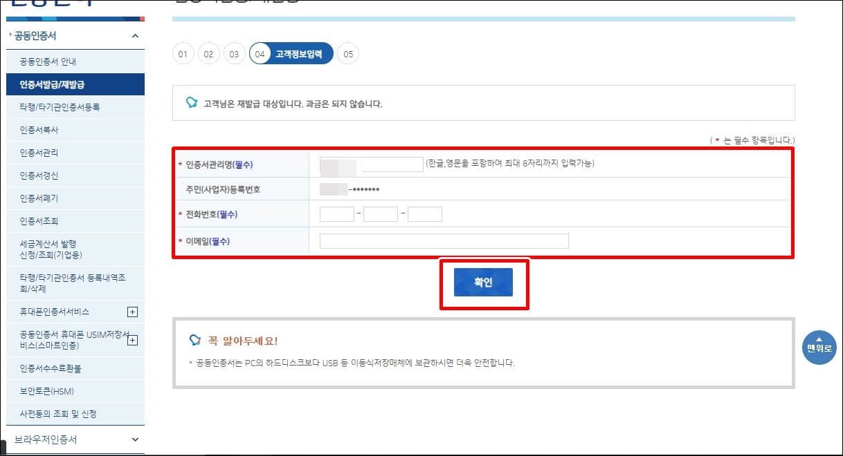 인증서 관리명, 주민등록번호, 전화번호, 이메일 등을 입력하시고 확인을 클릭합니다.